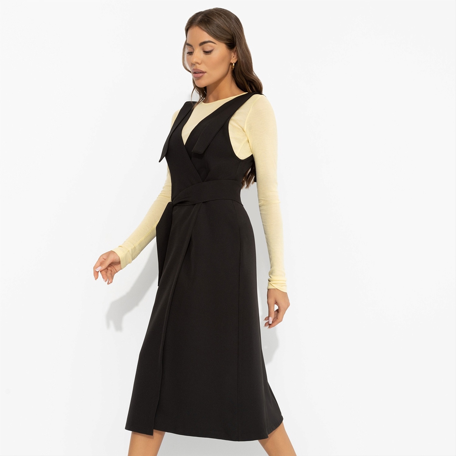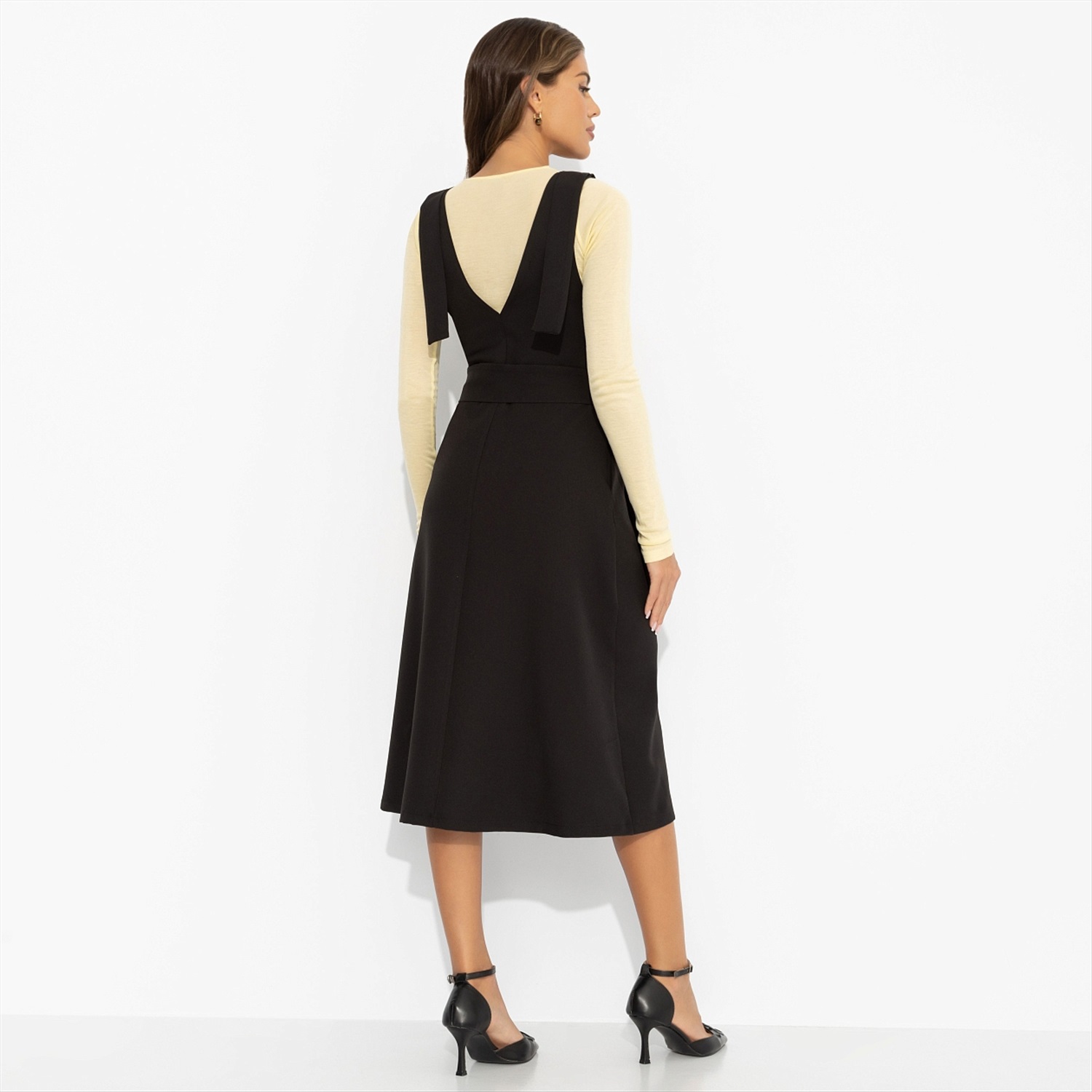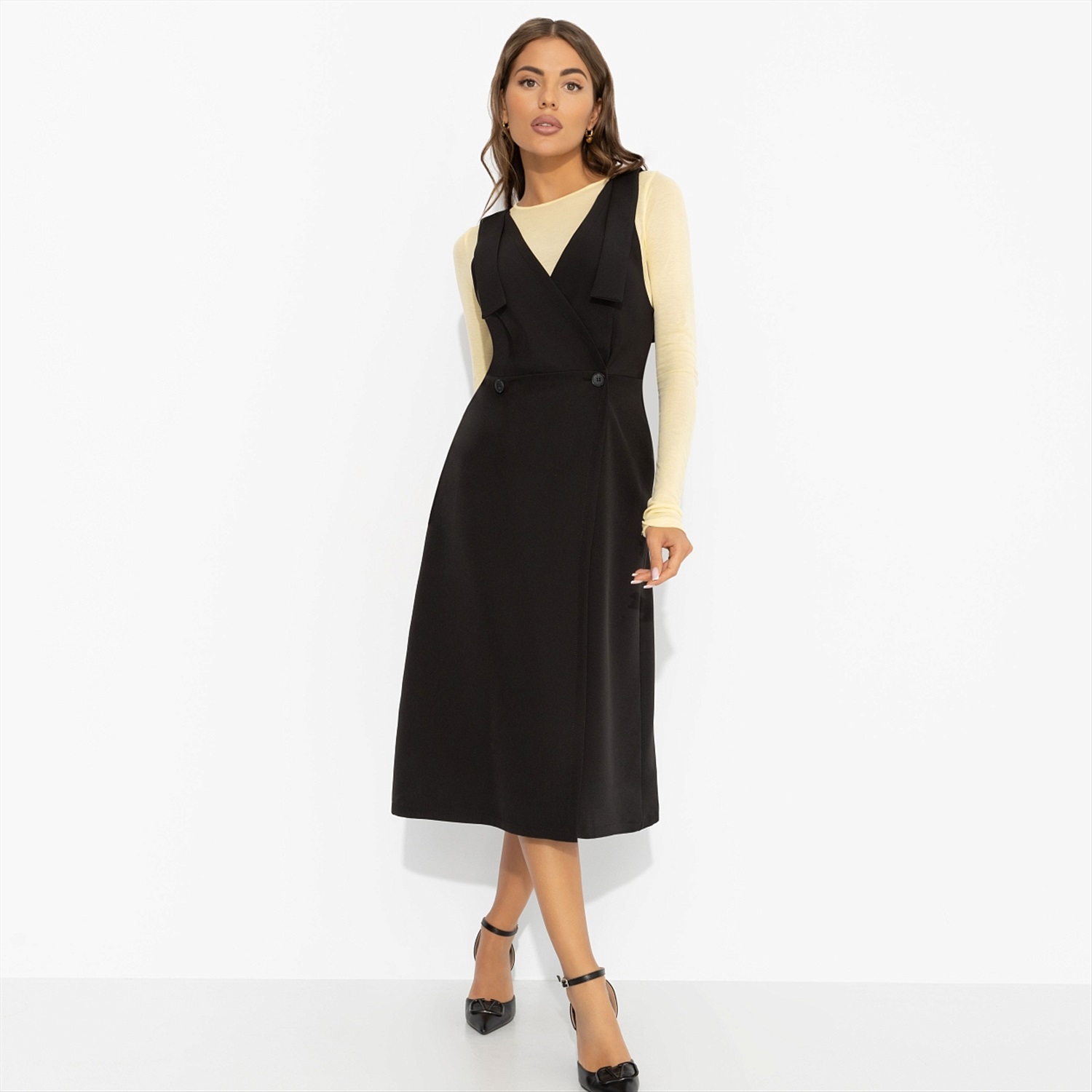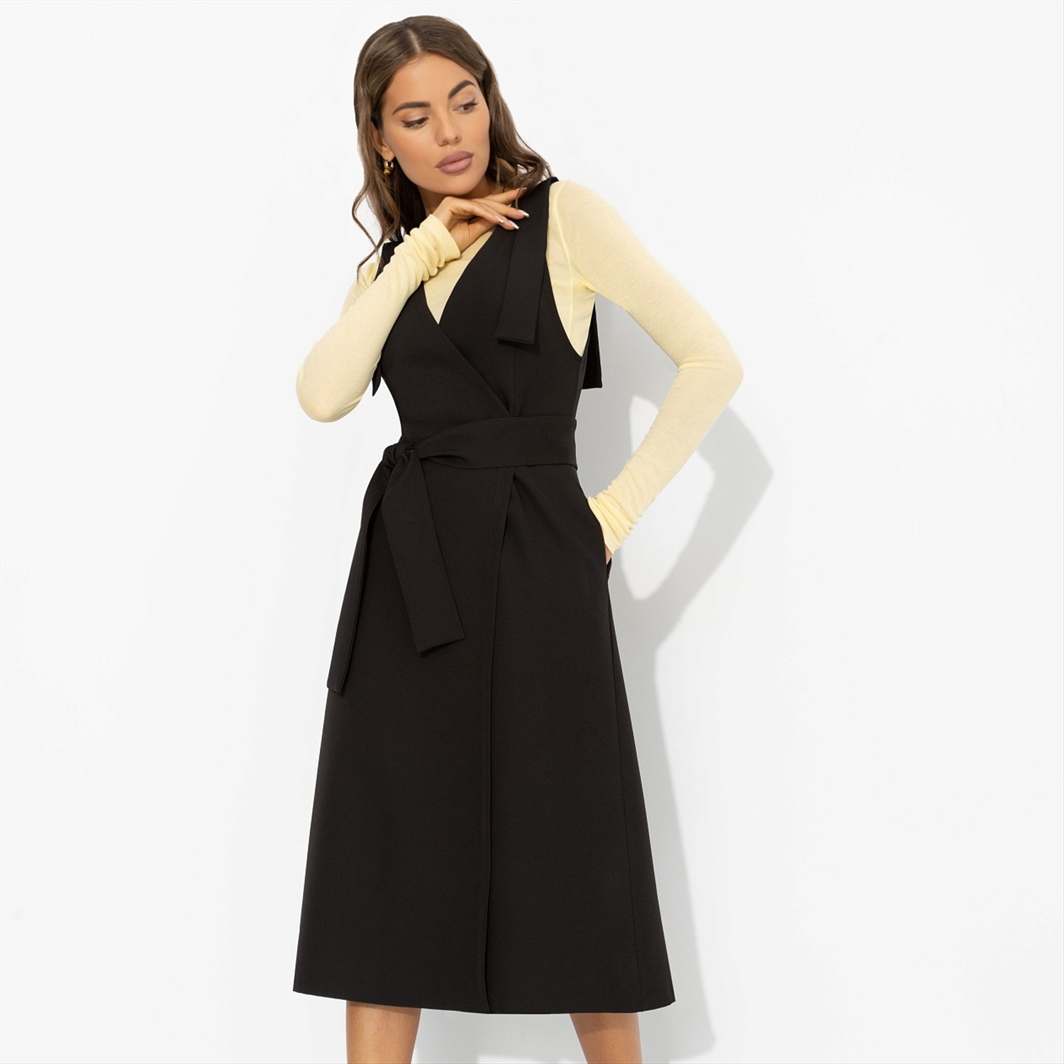 Строгий миди-силуэт с идеальными линиями превращает утреннюю спешку в уверенный выход. Белая рубашка под сарафан ЧАРУТТИ добавит офисного шика. А вечером можно надеть сарафан как самостоятельный предмет гардероба, оставляя коллег в недоумении: «Неужели это тот же наряд?». Сарафан в длине миди. Силуэт приталенный. Пояс в комплекте. Сарафан на запах, который создает деликатный вырез по передней части изделия. Декоративные ленты на плечах прошиты, лямки не регулируются. Есть карманы. Сарафан имеет завязки с внутренней стороны. Комментарии к товару