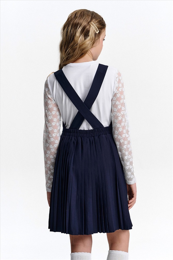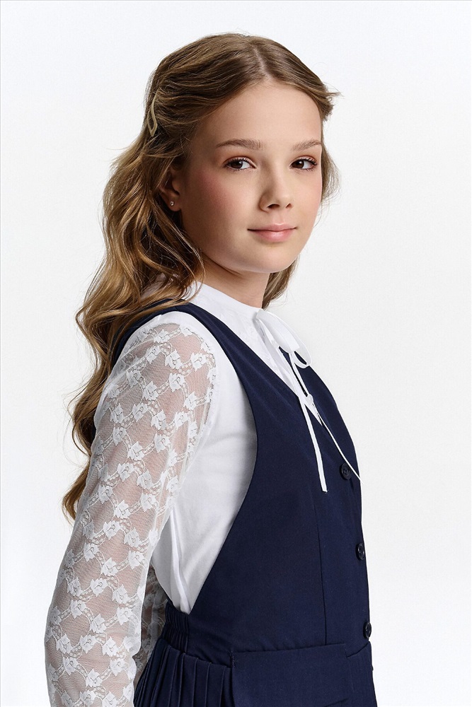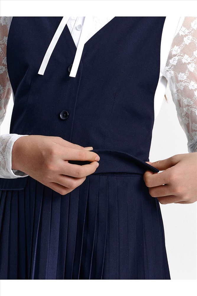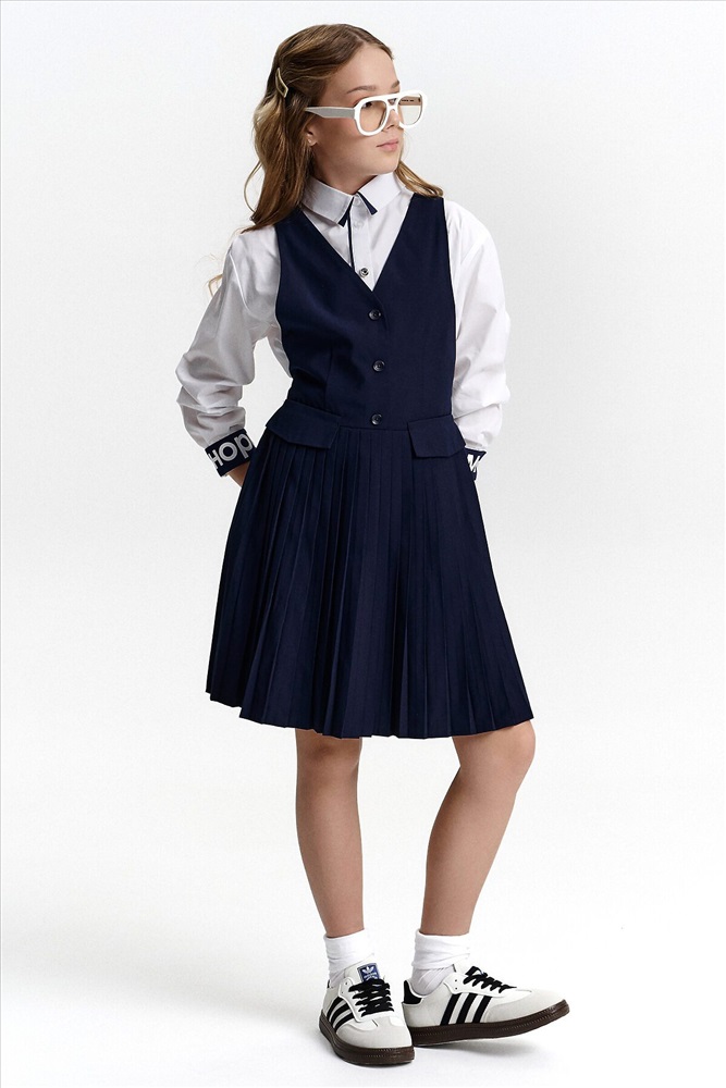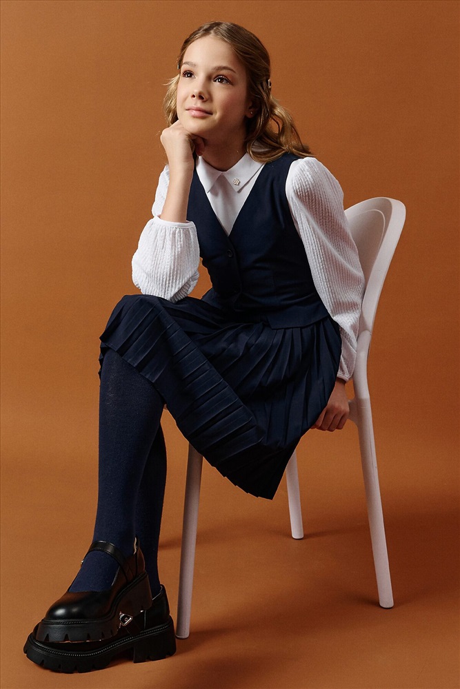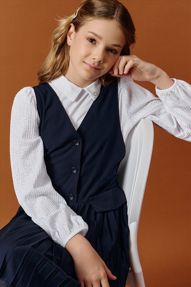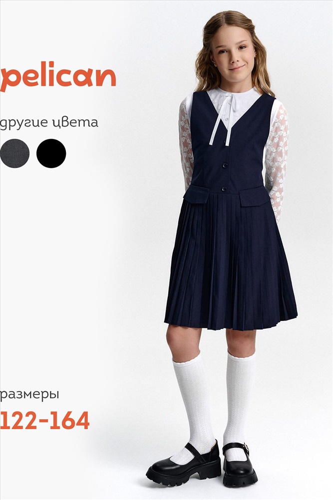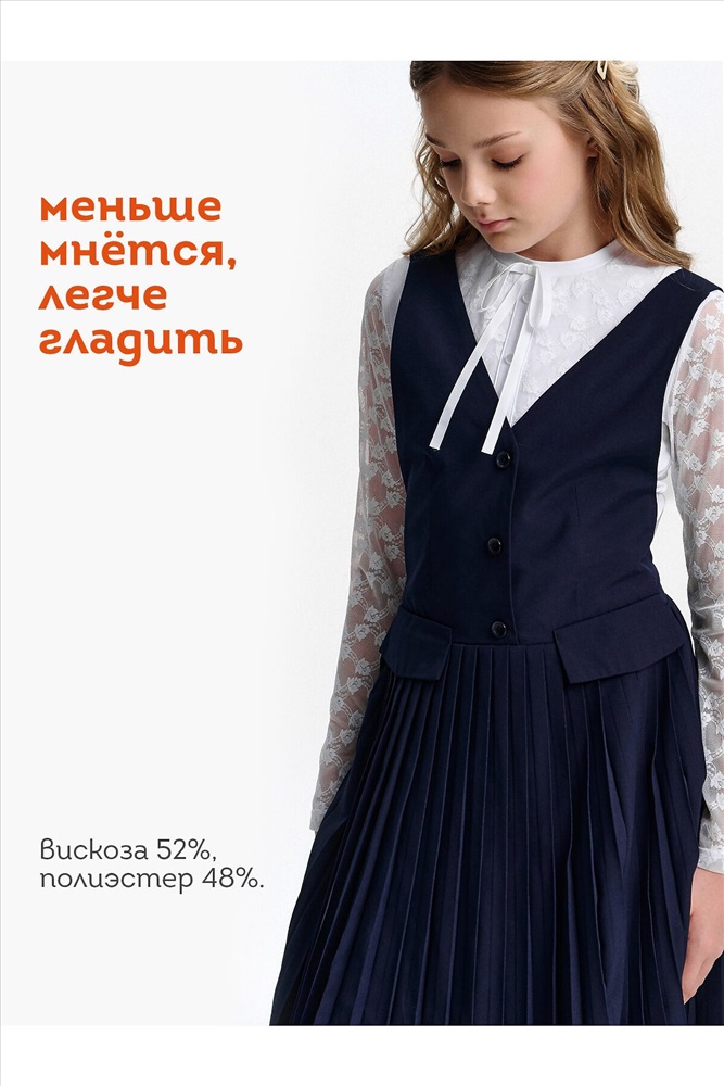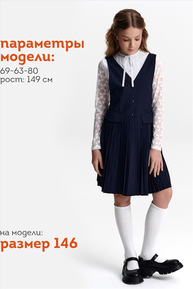 ID товара: 1188857 Состав: 52% Вискоза, 48% Полиэстер Сезон: Демисезон Длина: До колена Фасон: Приталенное Рукав: Без рукавов Вид застежки: Пуговицы Вырез горловины: V-образный Основная ткань: Вискоза Стиль: классический Страна бренда: Россия Страна производства: Китай Швейный сарафан с юбкой в мелкую плиссировку — удобный и стильный выбор для школы и не только. Мелкие складки шириной 5 мм создают аккуратный, ровный рисунок, который не мнётся и сохраняет форму даже после долгого учебного дня. Верх сарафана — жилет с застёжкой на пуговицы спереди. Спинка с перекрещивающимися лямками регулируется по длине, чтобы сарафан идеально сидел на ребёнке любого роста. Лямки крепятся к юбке на потайные пуговицы, что обеспечивает надёжную фиксацию и комфорт при движении. Декоративные клапаны на линии талии придают школьному образу стиль и аккуратность. Юбка сзади на внутренней резинке — она помогает сарафану удобно сидеть на талии, не сползать и не мешать во время уроков и активных перемен. Сшит из смесовой ткани — практичный материал, который не мнётся, дышит и легко стирается. Сарафан прослужит долго, сохраняя аккуратный вид как в школе, так и в повседневной жизни. Выбирайте нужный размер по таблице размеров на фото. Цвет товара на экране вашего устройства может отличаться от цвета изделия вживую. Комментарии к товару