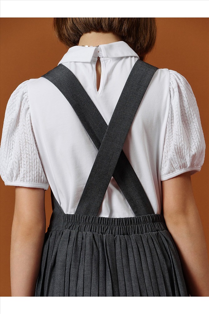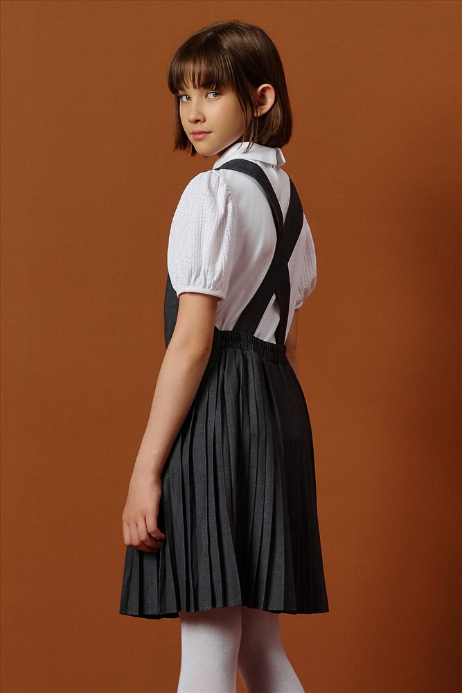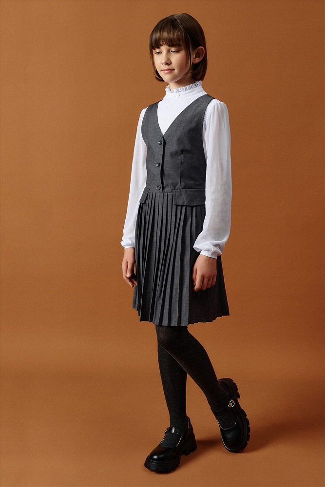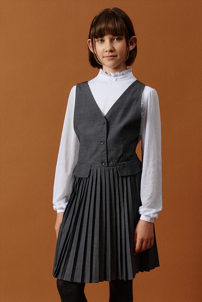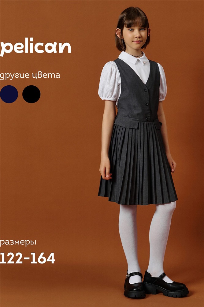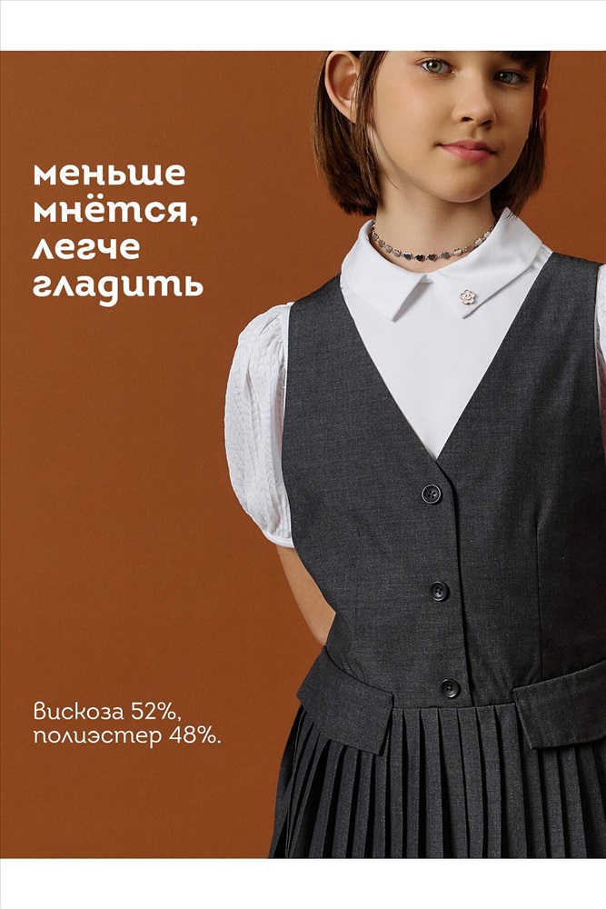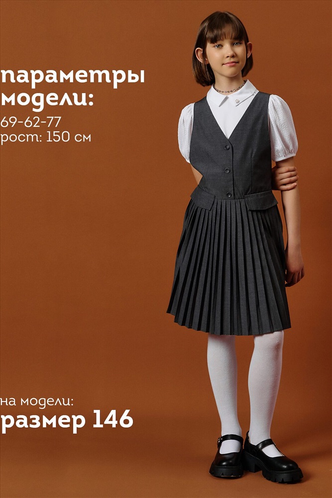 ID товара: 1188859 Состав: 52% Вискоза, 48% Полиэстер Сезон: Демисезон Длина: До колена Фасон: Приталенный Рукав: Без рукавов Вид застежки: Пуговицы Вырез горловины: V-образный Основная ткань: Вискоза Стиль: классический Страна бренда: Россия Страна производства: Китай Швейный сарафан с юбкой в мелкую плиссировку — удобный и стильный выбор для школы и не только. Мелкие складки шириной 5 мм создают аккуратный, ровный рисунок, который не мнётся и сохраняет форму даже после долгого учебного дня. Верх сарафана — жилет с застёжкой на пуговицы спереди. Спинка с перекрещивающимися лямками регулируется по длине, чтобы сарафан идеально сидел на ребёнке любого роста. Лямки крепятся к юбке на потайные пуговицы, что обеспечивает надёжную фиксацию и комфорт при движении. Декоративные клапаны на линии талии придают школьному образу стиль и аккуратность. Юбка сзади на внутренней резинке — она помогает сарафану удобно сидеть на талии, не сползать и не мешать во время уроков и активных перемен. Сшит из смесовой ткани — практичный материал, который не мнётся, дышит и легко стирается. Сарафан прослужит долго, сохраняя аккуратный вид как в школе, так и в повседневной жизни. Выбирайте нужный размер по таблице размеров на фото. Цвет товара на экране вашего устройства может отличаться от цвета изделия вживую. Комментарии к товару