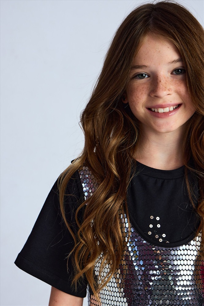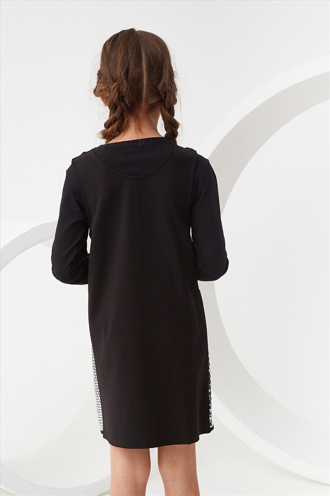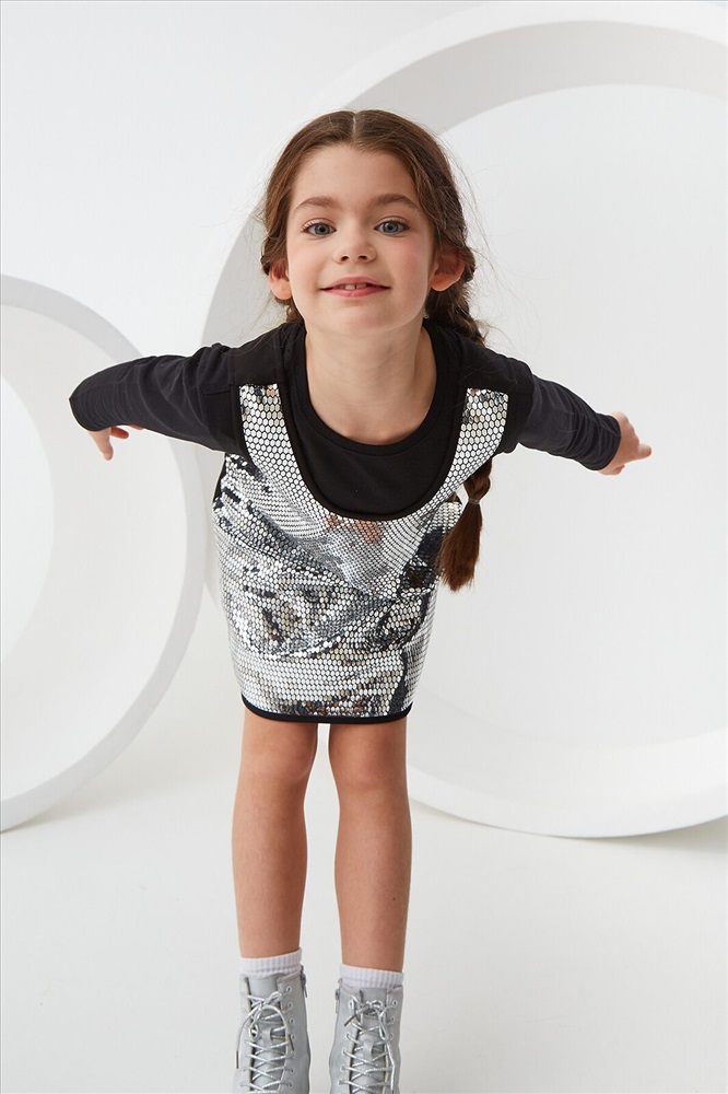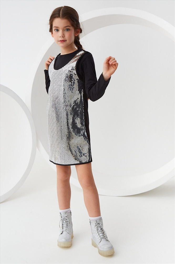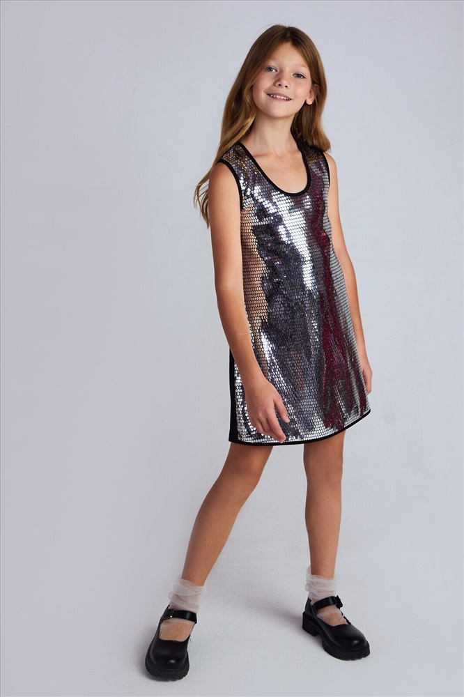 Трикотажный сарафан без рукавов. Актуальная модель свободного силуэта, который слегка расширяется к низу, без застежки. Спереди на сарафане сетка с пайетками спереди Сарафан органично впишется как в праздничный гардероб, так и подойдет для повседневных выходов.