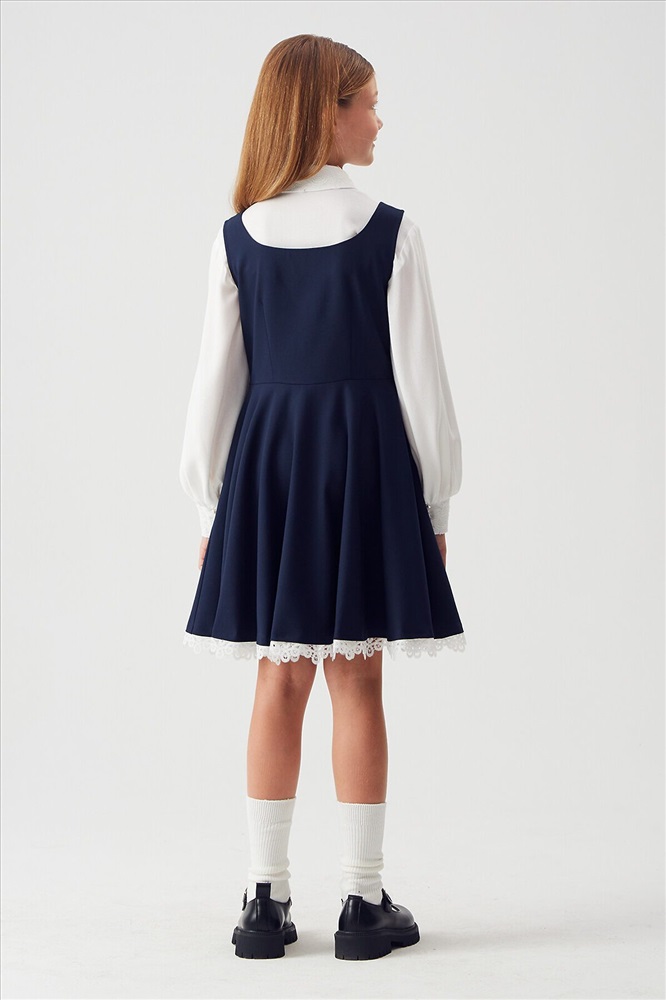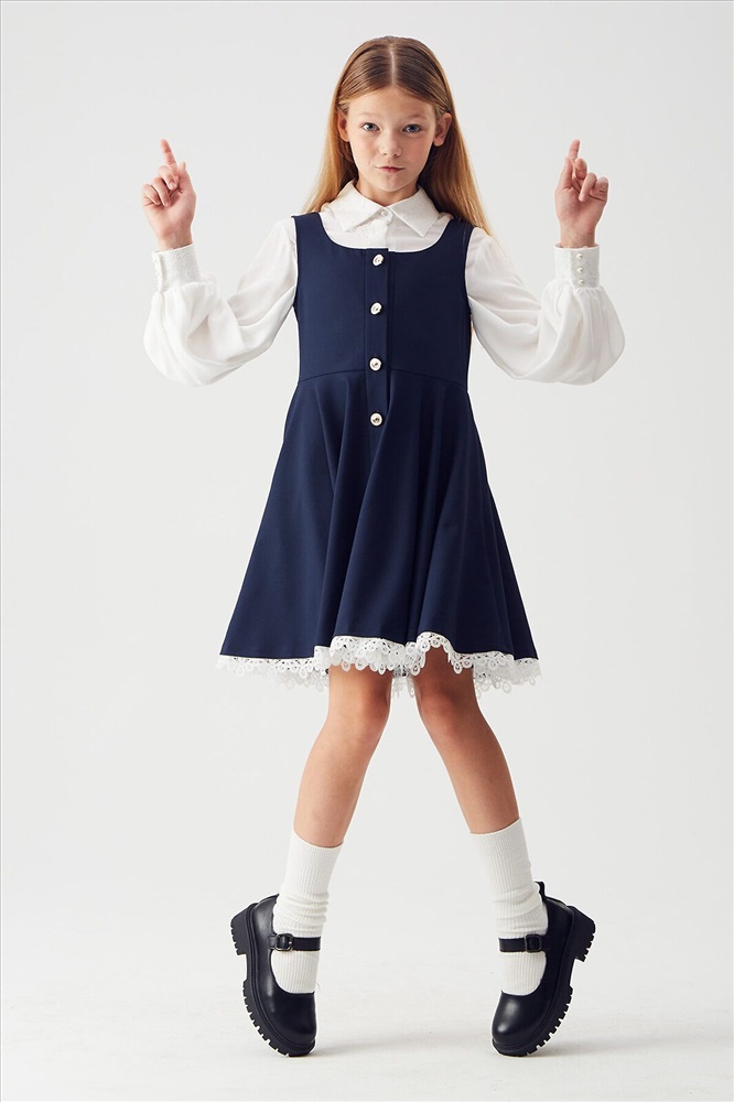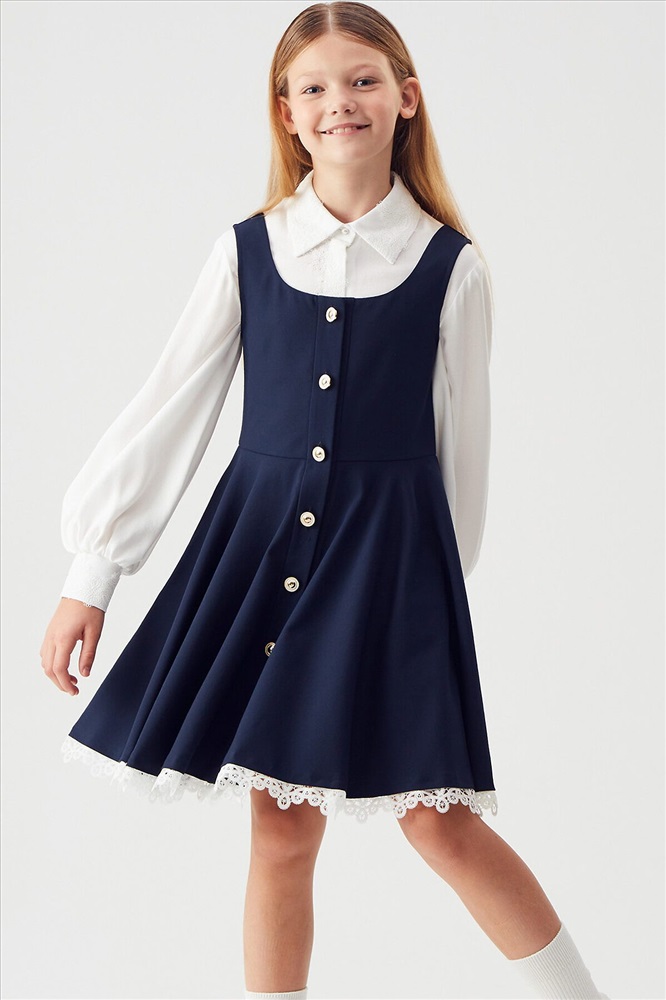 Сарафан для девочек станет отличным выбором для учебных будней. Он разработан с учетом потребностей школьной возрастной группы и обеспечивает комфорт в течение всего дня. Особенностью модели является застежка на пуговицах, что придает дополнительный стиль. Юбка выполнена в форме солнца, что позволяет свободно двигаться и чувствовать себя уверенно. Боковые швы юбки оснащены карманами, которые будут полезны для хранения мелочей или школьных принадлежностей. Нижняя часть изделия украшена кружевом, добавляющим изысканный штрих к классическому дизайну.