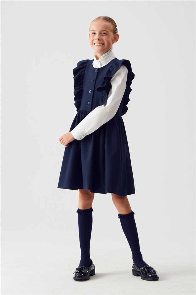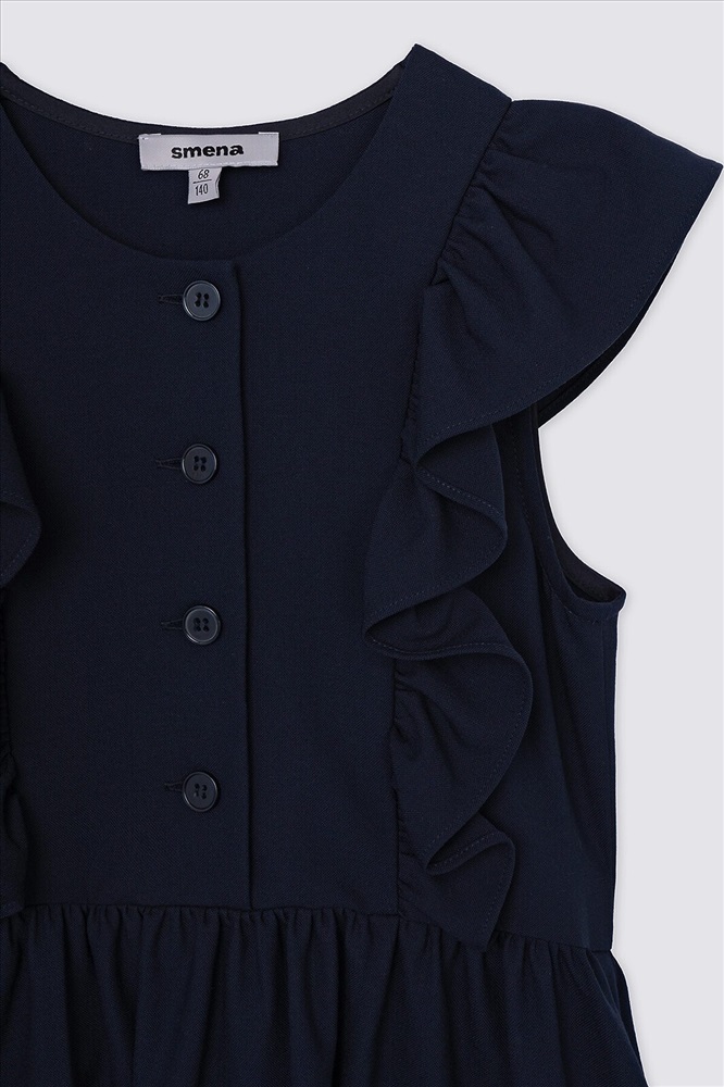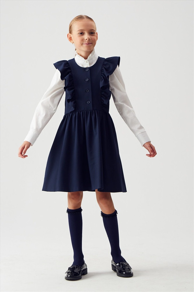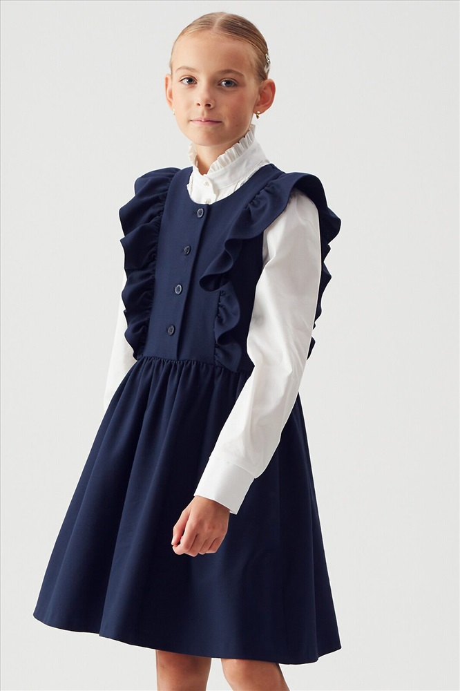 Сарафан для девочек идеально подходит для школы, обеспечивая комфорт и стиль. Этот вариант выполнен без подкладки, что делает его легким и удобным в носке. Центральная несквозная бортовая застежка добавляет практичности, позволяя легко надевать и снимать.Особое внимание уделено рельефным швам полочек лифа, в которые вложена оборка. Это создает оригинальный и привлекательный вид, который понравится многим девочкам. Юбка собрана из двух полотнищ, что придает ей пышность и выразительность. Сборка на шве талии обеспечивает идеальную посадку, а обработанные карманы в боковых швах юбки добавляют функциональности. Это делает сарафан не только красивым, но и удобным для повседневного использования в школьной обстановке.