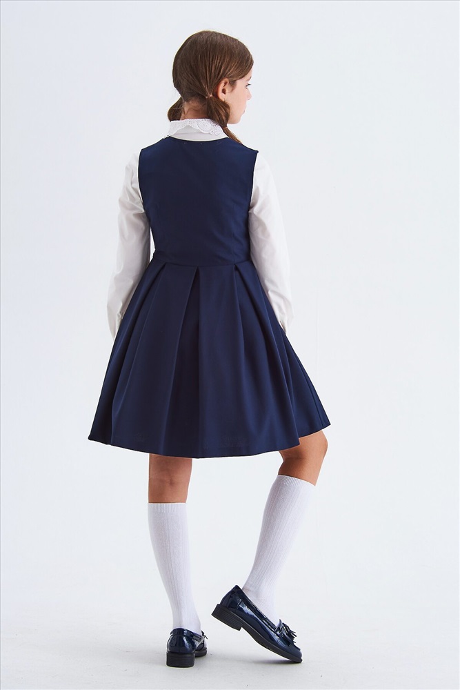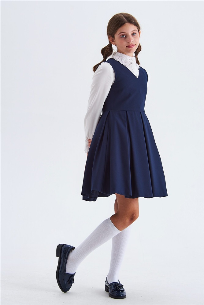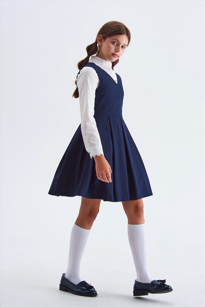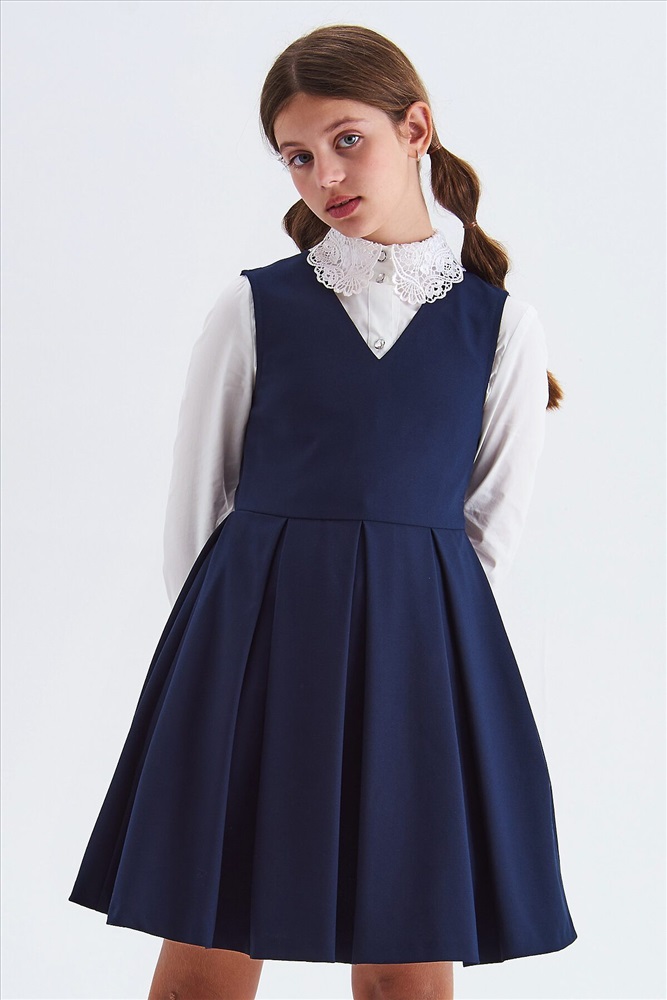 Сарафан А-силуэта, отрезной по линии талии из износостойкой костюмной поливискозы с V-образным вырезом. Потайная молния в боковом шве лифа. Юбка с мягкими складками, в боковых швах расположены карманы. В комплекте предусмотрен съемный подъюбник на пуговицах.