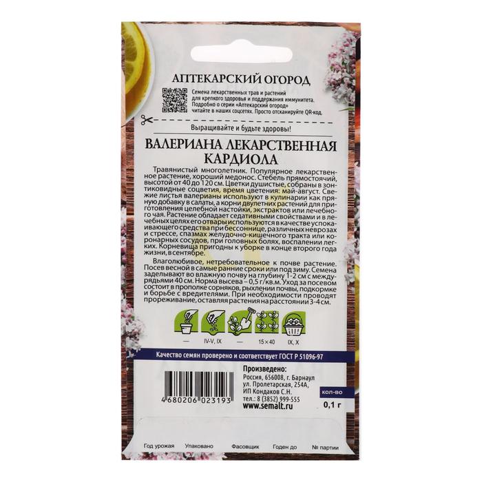Габариты: 15 x 8 x 0,2 Страна: Россия В боксе: 800 шт Состав: См. на упаковке Материалы: см. на упаковке Фасовка: по 10 шт Индивидуальная упаковка: Без упаковки Сертификат: Не подлежит сертификации Сроки созревания: Средний Посев (посадка) в грунт: Апрель, Май Место выращивания: Открытый грунт Применение: Лекарственная (лечебная) Можно выращивать на подоконнике: Нет Травянистый многолетник. Популярное лекарственное растение, хороший медонос. Стебель прямостоячий, высота от 40 до 120 см. Цветки душистые, собраны в зонтиковидные соцветия, время цветения: май-август. Свежие листья валерианы используют в кулинарии как пряную добавку в салаты, а корни двулетних растений для приготовления целебной настойки, экстрактов или лечебного чая. Растение обладает седативными свойствами и в лечебных целях его отвары используются в качестве успокаивающего средства при бессоннице, различных неврозах и стрессе, спазмах желудочно-кишечного тракта или коронарных сосудов, при головных болях, воспалении легких. Корневища пригодны к уборке в конце второго года жизни, в сентябре. Влаголюбивое, не требовательное к почве растение. Посев весной в самые ранние сроки или под зиму. Семена заделывают во влажную почву на глубину 1-2 см с междурядьями 40 см. Норма высева —0,5 г/кв.м. Уход за посевом состоит в прополке сорняков, рыхлении почвы, подкормке и борьбе с вредителями. Комментарии к товару