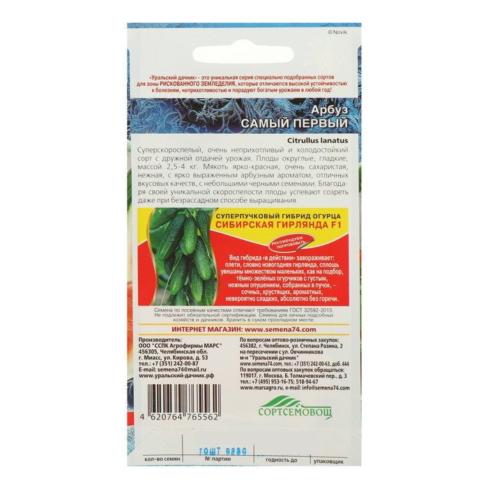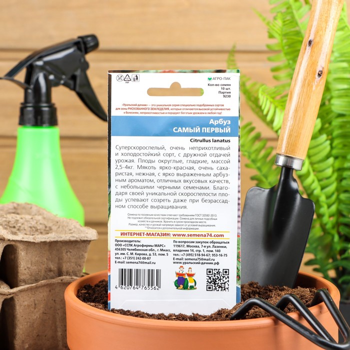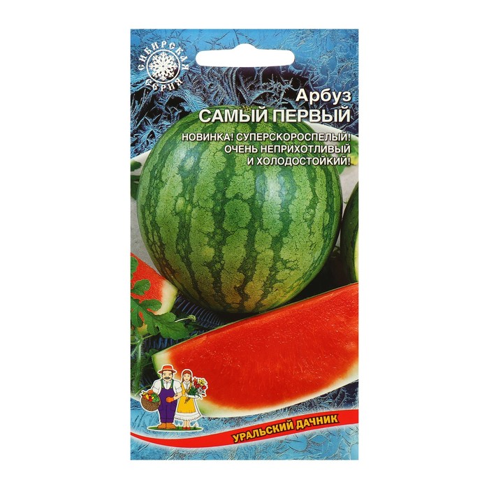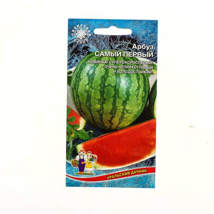 Габариты: 15 x 8 x 0,1 Страна: Россия В боксе: 500 шт Состав: Семена Материалы: семена Фасовка: по 1 шт Индивидуальная упаковка: Без упаковки Сертификат: Не подлежит сертификации Цвет: Зелёный Сроки созревания: Сверхранний (скороспелый) Посев на рассаду: Май Посев (посадка) в грунт: Май, Апрель Упаковка: Цветная Место выращивания: Открытый грунт Урожай: Август - Сентябрь Сорт или гибрид: Сорт Окрас мякоти плода: Красный Сорт: Ультраскороспелый Суперскороспелый, очень неприхотливый и холодостойкий сорт, с дружной отдачей урожая. Плоды округлые, гладкие, массой 2,5-4кг. Мякоть ярко-красная, очень сахаристая, нежная, с ярко выраженным арбузным ароматом, отличных вкусовых качеств, с небольшими чёрными семенами. Благодаря своей уникальной скороспелости плоды успевают созреть даже при безрассадном способе выращивания. Комментарии к товару
