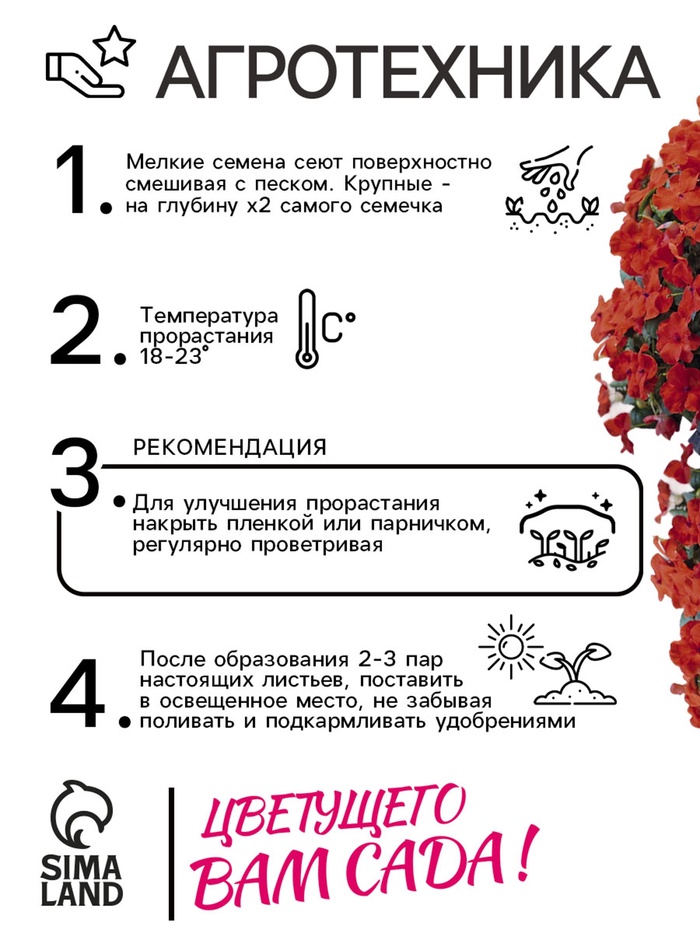Габариты: 15 x 8 x 0,1 Страна: Россия В боксе: 1000 шт Состав: См. на упаковке Материалы: см. на упаковке Фасовка: по 10 шт Индивидуальная упаковка: Без упаковки Сертификат: Не подлежит сертификации Цвет: Красный Вегетация: Однолетники Вид: Бальзамин Посев на рассаду: Март, Апрель Посев (посадка) в грунт: Апрель, Июнь, Май, Март Цветение период: Июль, Июнь Место выращивания: Универсальный Подходит для балкона: Да Сухоцвет: Нет Махровые: Да Высота растений: До 30 см По форме куста: Кустовая, Ампельная Назначение: Для создания цветников, клумбы Отношение к свету: Рассеянный свет Разновидность: Цветущее Нуждаются ли в стратификации: Нет Новая великолепная ампельная серия бальзамина, известного как недотрога или Ванька мокрый. Однолетняя культура, в комнатных условиях может выращиваться как многолетник. Растения крепкие, компактные, высотой 20-25 см, в поперечнике до 30-35 см. Цветение раннее, обильное и продолжительное. Цветки крупные, до 4,5 см в диаметре, ярких, насыщенных и чистых окрасок: лососевой, розовой, сиреневой с выразительным пятнышком в центре. Используется для украшения уличных вазонов, контейнеров, красиво смотрится при оформлении края клумб, рабаток, бордюров, также рекомендован в качестве комнатного растения. Растение теплолюбивое, в открытом грунте при наступлении холодных ночей увядает. Предпочитает слегка затененные места в саду или комнате. Не выносит переувлажнения. Комментарии к товару