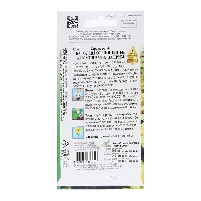 Габариты: 15 x 8 x 0,1 Страна: Россия В боксе: 500 шт Состав: Семена Материалы: семена Фасовка: по 10 шт Индивидуальная упаковка: Без упаковки Сертификат: Не подлежит сертификации Цвет: Жёлтый Вегетация: Многолетники Вид: Бархатцы Посев на рассаду: Апрель Посев (посадка) в грунт: Май Цветение период: Сентябрь, Июль, Август, Июнь Место выращивания: Открытый грунт Сухоцвет: Нет Махровые: Нет Высота растений: До 30 см По форме куста: Кустовая Назначение: Для балкона, веранды, Для создания цветников, клумбы Отношение к свету: Рассеянный свет Разновидность: Цветущее Удивительные бархатцы покорили не одно сердце садовода-любителя. Крем Брюле- представитель чудесной серии бархатцев отклоненных Alumia, это эксклюзивный сорт, летник премиум-класса. Уникальный цвет этих бархатцев выделяет их из множества привычных сортов, не перестает удивлять своей прекрасной внешностью. Восхитительные цветки будут лучиться, словно огоньки, на фоне сочной зелени. На протяжении всего лета балконы, клумбы, рабатки будут необычайно привлекательны, растения выровненные, и очень яркие по своей окраске. Сорт ультра ранний, зацветает в рассаде. Хорошо ветвящийся от основания кустик стойко переносит непогоду, не разваливаясь от порывов ветра, сильных дождей. Прекрасно растет в балконных и садовых контейнерах. В открытом грунте растения хороши в бордюрах, массивами на рабатках, по переднему краю сборных цветников, станут отличным помощником в заполнении промежутков между соседними растениями. Высота растения-25 см. Диаметр цветка-5-6 см. Посев семян в марте-апреле на рассаду, в мае - в открытый грунт на глубину 1-1,5 см. Через 10 дней появятся всходы. Пикировку проводят через 7 дней после появления всходов. В мае высаживают в грунт с интервалом 20х20 см. Это одна из самых неприхотливых в уходе культур. Предпочитают открытые солнечные места, но растут и в полутени, нетребовательны к почве и влаге. Для хорошего роста и цветения молодые растения нужно поливать и подкармливать в течение сезона. Чтобы продлить цветение необходимо удалять увядшие цветки. Комментарии к товару