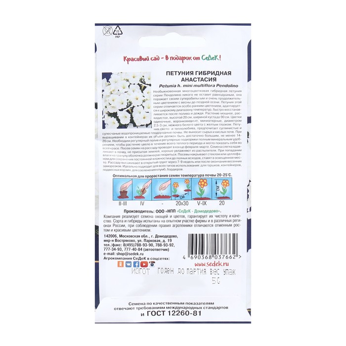 Габариты: 15 x 7,5 x 1 Страна: Россия В боксе: 100 шт Состав: См. на упаковке Материалы: см. на упаковке Фасовка: по 6 шт Индивидуальная упаковка: Без упаковки Сертификат: Не подлежит сертификации Цвет: Белый Вегетация: Однолетники Вид: Петуния Место выращивания: Открытый грунт Сухоцвет: Нет Махровые: Нет По форме куста: Кустовая Назначение: Для создания цветников, клумбы Фиксированная цена: Да Яркая, эффектная петуния с крупными контрастными цветками O 8-10 см. Кустики компактные, высотой до 30 см, с хорошим базальным ветвлением, сохраняют декоративность даже в непогоду. Цветки с плотной фактурой венчика, не травмируются дождем и ветром. Цветение обильное и длительное. Подходит для цветников, балконных и садовых контейнеров. Посев семян на рассаду. Семена в гранулах! Гранулы располагают на поверхности почвы, не заделывая их, хорошо увлажняют из распылителя. При попадании влаги на гранулу оболочка должна раствориться. Посевы накрывают стеклом для сохранения постоянной влажности до полных всходов. Февральским посевам требуется дополнительная подсветка. Сеянцы пикируют в фазе одного-двух настоящих листьев. В фазе пяти-шести листьев проводят формирующую прищипку. Рассаду высаживают в открытый грунт, когда минует угроза заморозков. Комментарии к товару