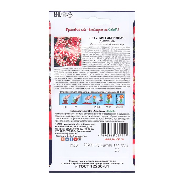 Габариты: 15 x 7,5 x 0,5 Страна: Россия В боксе: 100 шт Состав: См. на упаковке Материалы: см. на упаковке Фасовка: по 10 шт Индивидуальная упаковка: Без упаковки Сертификат: Не подлежит сертификации Цвет: Разноцветный, Красный, Белый Вегетация: Однолетники Вид: Петуния Место выращивания: Открытый грунт Сухоцвет: Нет Махровые: Нет По форме куста: Кустовая Назначение: Для создания цветников, клумбы Многоцветковая гибридная петуния серии Моя радость отличается необычайно богатым, обильным и продолжительным цветением с весны до поздней осени, адаптируясь к широкому диапазону температур, от -5°C до +40°C. Растение компактное, прямостоячее, шаровидное, высотой 25-30 см, шириной куста 40 см. Цветки одиночные, воронковидные, диаметром 6-7 см, нарядные, красного цвета с рисунком белой звезды. Петуния свето- и теплолюбива, предпочитает суглинистые и супесчаные водопроницаемые плодородные почвы. Не выносит сырых и кислых почв. При выращивании в контейнерах их объём должен быть достаточно большим, не менее 14-20 см. Необходим регулярный полив и регулярные подкормки полным минеральным удобрением, чтобы растение цвело в течение всего теплого периода и могло показать себя во всей красе. Посев семян на рассаду проводят в конце февраля-марте. Семена слегка вдавливают в почву, не присыпая землей, хорошо увлажняют из распылителя. При попадании влаги на гранулу оболочка должна раствориться. Посевы накрывают стеклом или целлофаном для сохранения постоянной влажности и до полных всходов, ставят в освещенное место. Рассаду высаживают в открытый грунт через 7-9 недель или после окончания весенних заморозков. Идеально подходит для всех типов использования: для горшков, контейнеров, подвесных корзин, для озеленения клумб, бордюров. Комментарии к товару