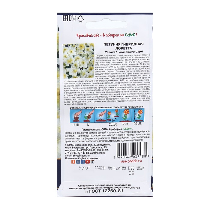 Гибрид крупноцветковой петунии серии Капри с невероятно крупными цветками и обильным продолжительным цветением, адаптируется к широкому диапазону температур, от -5°C до +40°C. Растение мощное, прямостоячее, высотой 20-25 см, ширина куста 40-50 см. Цветки одиночные, воронковидные, крупные, диаметром 12-14 см, золотисто-лимонного цвета. Петуния свето- и теплолюбива, предпочитает суглинистые и супесчаные водопроницаемые плодородные почвы. Не выносит сырых и кислых почв. При выращивании в контейнерах их объём должен быть достаточно большим, не менее 14-20 см. Необходим регулярный полив и регулярные подкормки полным минеральным удобрением, чтобы растение цвело в течение всего теплого периода и могло показать себя во всей красе.