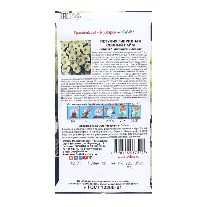 Габариты: 15 x 8 x 0,5 Страна: Россия В боксе: 100 шт Состав: См. на упаковке Материалы: см. на упаковке Фасовка: по 10 шт Индивидуальная упаковка: Без упаковки Сертификат: Не подлежит сертификации Цвет: Белый Вегетация: Однолетники Вид: Петуния Место выращивания: Открытый грунт Сухоцвет: Нет Махровые: Нет По форме куста: Кустовая Назначение: Для создания цветников, клумбы Фиксированная цена: Да Многоцветковая гибридная петуния серии Джоконда отличается обильным цветением с весны до поздней осени. Растение мощное, прямостоячее, высотой 25-27 см, ширина куста 50-60 см. Цветки одиночные, воронковидные, крупные, диаметром 7-8 см, нежного лимонно-желтого цвета. Петуния свето- и теплолюбива, предпочитает суглинистые и супесчаные водопроницаемые плодородные почвы. Не выносит сырых и кислых почв. При выращивании в контейнерах их объём должен быть достаточно большим, не менее 14-20 см. Необходим регулярный полив и регулярные подкормки полным минеральным удобрением, чтобы растение цвело в течение всего теплого периода и могло показать себя во всей красе. Посев семян на рассаду проводят в конце февраля-марте. Семена слегка вдавливают в почву, не присыпая землей, хорошо увлажняют из распылителя. При попадании влаги на гранулу оболочка должна раствориться. Посевы накрывают стеклом или целлофаном для сохранения постоянной влажности и до полных всходов, ставят в освещенное место. Рассаду высаживают в открытый грунт через 7-9 недель или после окончания весенних заморозков. Идеально подходит для всех типов использования: для горшков, контейнеров, подвесных корзин, для озеленения клумб, бордюров. Комментарии к товару