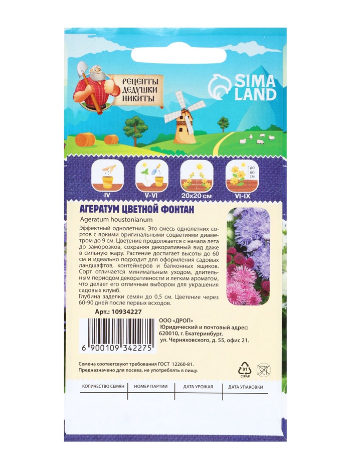 Габариты: 15 x 8 x 0,2 Страна: Россия В боксе: 3100 шт Состав: Семена Материалы: семена Фасовка: по 10 шт Индивидуальная упаковка: Без упаковки Габариты товара: 17 см × 10 см × 1 см Сертификат: Не подлежит сертификации Цвет: МИКС Вегетация: Однолетники Вид: Агератум Посев на рассаду: Апрель Посев (посадка) в грунт: Июнь, Май Цветение период: Июль, Август, Июнь, Сентябрь Упаковка: Цветная Место выращивания: Открытый грунт Сухоцвет: Нет Махровые: Нет Высота растений: 30-60 см По форме куста: Кустовая Назначение: Для создания цветников, клумбы Отношение к свету: Светолюбивые Разновидность: Цветущее Нуждаются ли в стратификации: Нет Агератум «Цветной фонтан» - это очаровательный однолетник с нежными, пушистыми соцветиями, напоминающими маленькие помпончики. Смесь окрасок создает эффект красочного, струящегося фонтана, идеально подходящего для оформления переднего плана цветников, бордюров и контейнеров.