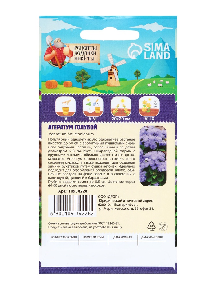 Габариты: 15 x 8 x 0,2 Страна: Россия В боксе: 2500 шт Состав: Семена Материалы: семена Фасовка: по 10 шт Индивидуальная упаковка: Без упаковки Габариты товара: 17 см × 10 см × 1 см Сертификат: Не подлежит сертификации Цвет: Сиреневый Вегетация: Однолетники Вид: Агератум Посев на рассаду: Апрель Посев (посадка) в грунт: Июнь, Апрель, Май Цветение период: Июль, Сентябрь, Июнь, Август Место выращивания: Открытый грунт Сухоцвет: Нет Махровые: Нет Высота растений: 30-60 см По форме куста: Кустовая Назначение: Для создания цветников, клумбы Отношение к свету: Светолюбивые Разновидность: Цветущее Нуждаются ли в стратификации: Нет Агератум голубой - это классический однолетник, который ценится садоводами за нежный сиреневый оттенок соцветий и невероятную продолжительность цветения. Его пушистые, бархатистые «помпончики» создают на клумбе эффект воздушного, струящегося облака, идеально подходящего для бордюров и обрамления цветников.