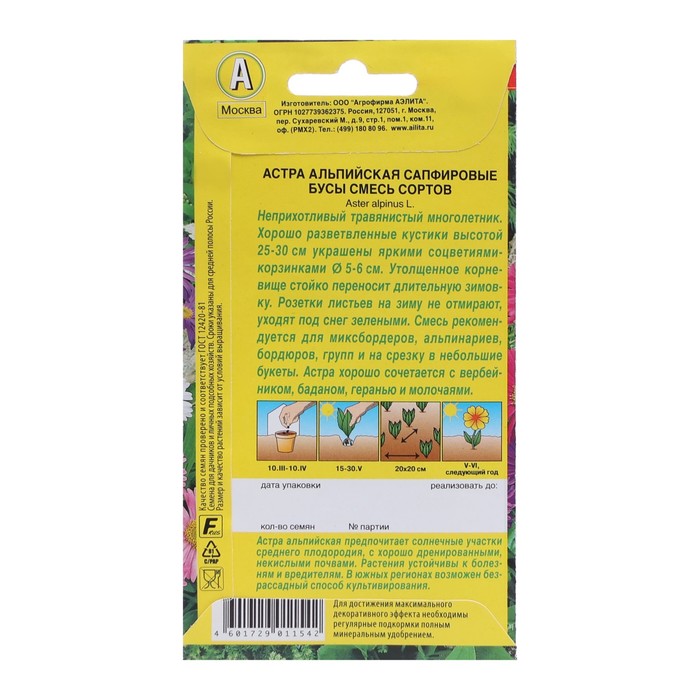 Габариты: 0,1 x 8 x 15 Страна: Германия В боксе: 50 шт Состав: См. на упаковке Материалы: см. на упаковке Фасовка: по 1 шт Индивидуальная упаковка: Без упаковки Сертификат: Не подлежит сертификации Цвет: МИКС Высота, см: 30 Вегетация: Многолетники Вид: Прочие, Астра Тип: Уличные Посев на рассаду: Апрель, Март Посев (посадка) в грунт: Май, Июнь Цветение период: Апрель, Июнь, Май, Июль Упаковка: Цветная Место выращивания: Открытый грунт Сухоцвет: Нет Махровые: Да Высота растений: До 30 см По форме куста: Ампельная, Кустовая Назначение: Для создания цветников, клумбы Отношение к свету: Светолюбивые Разновидность: Цветущее Вид: Семечки Нуждаются ли в стратификации: Нет Среди российских садоводов альпийская астра популярна своими одиночными соцветиями-корзинками. Розетка листьев невысоких кустиков не отмирает на зиму и весной выходит из-под снега зелёной. Начиная со второго года жизни пик цветения астры приходится на конец мая–июнь, когда наблюдается дефицит цветущих многолетников. Рассаду готовят в начале мая, в открытый грунт семена заделывают в конце октября. Сеянцы пикируют в фазе 1–2 настоящих листьев. Растение крайне неприхотливо и устойчиво к болезням и вредителям. Любит свет. Требует своевременной поливки, прополки и подкормки. Высота: 30 см. Диаметр цветка: 6 см. Комментарии к товару