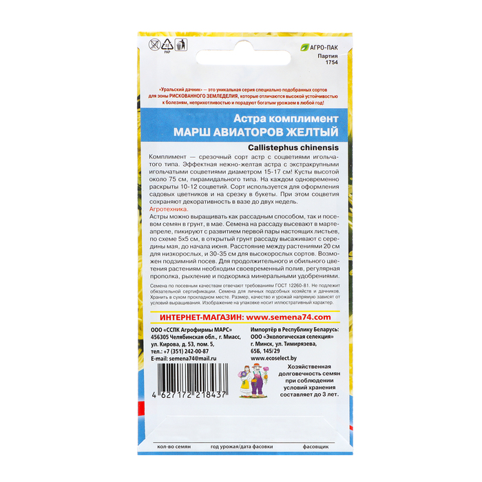 Габариты: 15 x 8 x 0,1 Страна: Россия В боксе: 500 шт Состав: См. на упаковке Материалы: см. на упаковке Фасовка: по 3 шт Индивидуальная упаковка: Без упаковки Сертификат: Не подлежит сертификации Цвет: Жёлтый Вегетация: Однолетники Вид: Астра Посев на рассаду: Апрель, Март Посев (посадка) в грунт: Май Цветение период: Сентябрь, Август, Июнь, Июль Место выращивания: Открытый грунт Сухоцвет: Нет Махровые: Нет По форме куста: Кустовая Назначение: Для создания цветников, клумбы Отношение к свету: Светолюбивые Разновидность: Цветущее Вид: Семечки Нуждаются ли в стратификации: Нет Наша коллекция семян включает как популярные овощи, так и яркие цветы, идеально подходящие для вашего сада. С нами вы сможете наслаждаться богатым урожаем и великолепием цветения в любое время года. Данные семена идеально подойдут для выращивания в вашем саду. Комментарии к товару