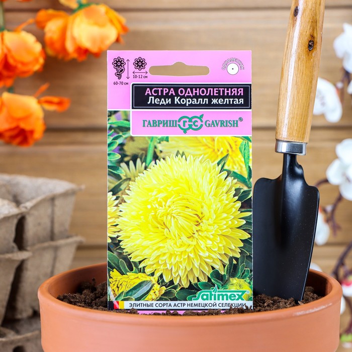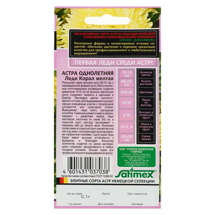 Роскошная серия высоких астр (60-70 см) с пирамидальной формой куста. Многочисленные плотно-махровые розовидные соцветия диаметром 10-12 см на прочных цветоносах долго сохраняют свежесть в цветниках и букетах. Язычковые цветки золотисто-желтого оттенка. Для выращивания подходят хорошо освещенные участки с плодородной суглинистой или супесчаной почвой. Выращивают чаще всего рассадным способом. Семена высевают в марте-апреле, пикируют с развитием первой пары настоящих листочков по схеме 5х5 см, в открытый грунт рассаду высаживают с середины мая до начала июня. Возможен посев семян в открытый грунт ранней весной или под зиму с последующим мульчированием торфом или опилками. Сорта серии Леди Корал имеют высокую устойчивость к фузариозу и благодаря большому количеству соцветий на одном растении долго сохраняют декоративность в любых погодных условиях. Лучшая серия для профессионального выращивания на срезку.