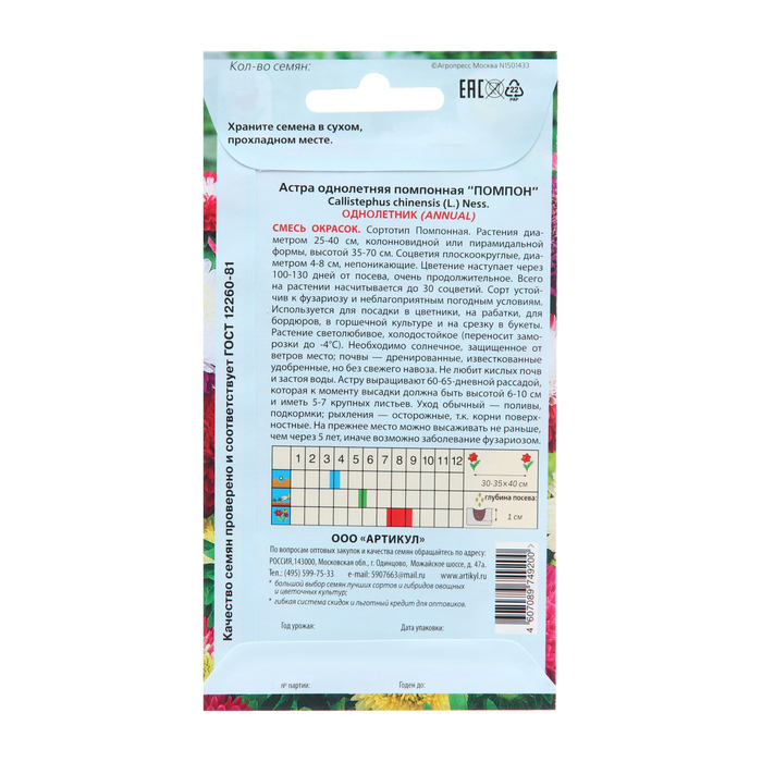 Габариты: 15 x 8 x 0,2 Страна: Россия В боксе: 700 шт Состав: См. на упаковке Материалы: см. на упаковке Фасовка: по 7 шт Индивидуальная упаковка: Без упаковки Сертификат: Не подлежит сертификации Цвет: МИКС Вегетация: Однолетники Вид: Астра Место выращивания: Открытый грунт Сухоцвет: Нет Махровые: Нет По форме куста: Кустовая Назначение: Для создания цветников, клумбы Наша коллекция семян включает как популярные овощи, так и яркие цветы, идеально подходящие для вашего сада. С нами вы сможете наслаждаться богатым урожаем и великолепием цветения в любое время года. Данные семена идеально подойдут для выращивания в вашем саду. Комментарии к товару