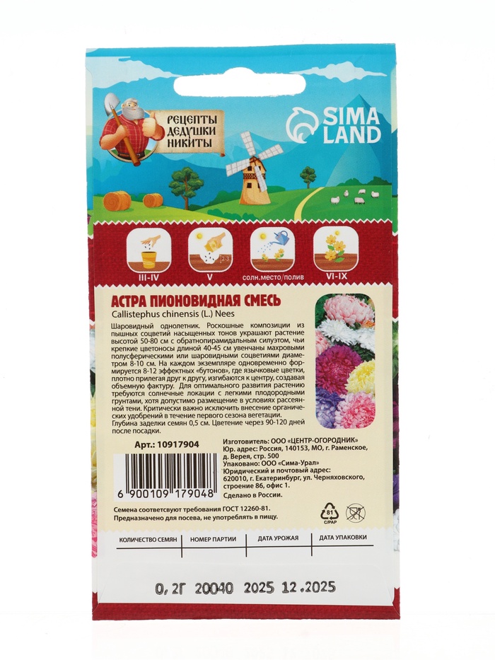 Производитель: Рецепты дедушки Никиты Габариты: 15 x 8 x 0,2 Страна: Россия В боксе: 1740 шт Состав: Семена Материалы: семена Фасовка: по 10 шт Индивидуальная упаковка: Без упаковки Габариты товара: 15 см × 7 см × 1 см Сертификат: Не подлежит сертификации Цвет: МИКС Вегетация: Однолетники Вид: Астра Посев на рассаду: Март, Апрель Посев (посадка) в грунт: Май Цветение период: Сентябрь, Июль, Август, Июнь Место выращивания: Открытый грунт, Закрытый грунт (теплицы, укрытия) Сухоцвет: Нет Махровые: Да Высота растений: 60-100 см По форме куста: Кустовая Назначение: Для создания букетов, Для создания цветников, клумбы Отношение к свету: Светолюбивые Разновидность: Цветущее Нуждаются ли в стратификации: Нет