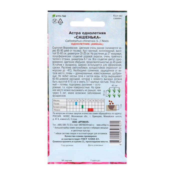 Габариты: 15 x 8 x 0,2 Страна: Россия В боксе: 700 шт Состав: См. на упаковке Материалы: см. на упаковке Фасовка: по 8 шт Сертификат: Не подлежит сертификации Цвет: Розовый Вегетация: Однолетники Вид: Астра Место выращивания: Открытый грунт Сухоцвет: Нет Махровые: Нет По форме куста: Кустовая Назначение: Для создания цветников, клумбы Фиксированная цена: Да Наша коллекция семян включает как популярные овощи, так и яркие цветы, идеально подходящие для вашего сада. С нами вы сможете наслаждаться богатым урожаем и великолепием цветения в любое время года. Данные семена идеально подойдут для выращивания в вашем саду. Комментарии к товару