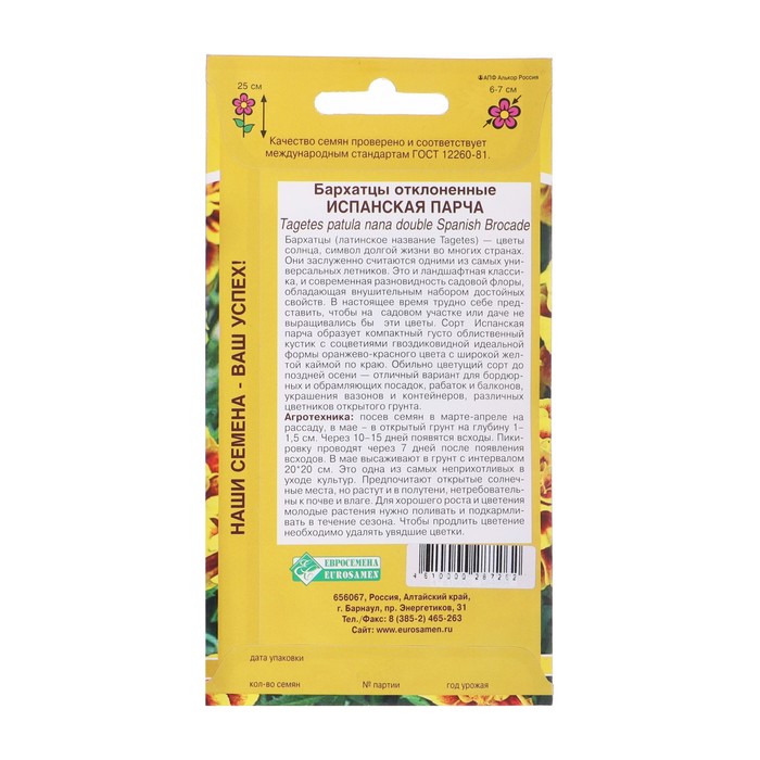 Габариты: 15 x 8 x 0,1 Страна: Россия В боксе: 500 шт Состав: См. на упаковке Материалы: см. на упаковке Фасовка: по 10 шт Сертификат: Не подлежит сертификации Цвет: Жёлтый Вегетация: Однолетники Вид: Бархатцы Посев на рассаду: Март, Апрель Посев (посадка) в грунт: Май Цветение период: Июнь, Июль, Август, Сентябрь, Октябрь Место выращивания: Открытый грунт Сухоцвет: Нет Махровые: Нет Высота растений: До 30 см По форме куста: Кустовая Назначение: Для создания цветников, клумбы, Для балкона, веранды Отношение к свету: Светолюбивые Разновидность: Цветущее Нуждаются ли в стратификации: Нет Наша коллекция семян включает как популярные овощи, так и яркие цветы, идеально подходящие для вашего сада. С нами вы сможете наслаждаться богатым урожаем и великолепием цветения в любое время года. Данные семена идеально подойдут для выращивания в вашем саду. Комментарии к товару