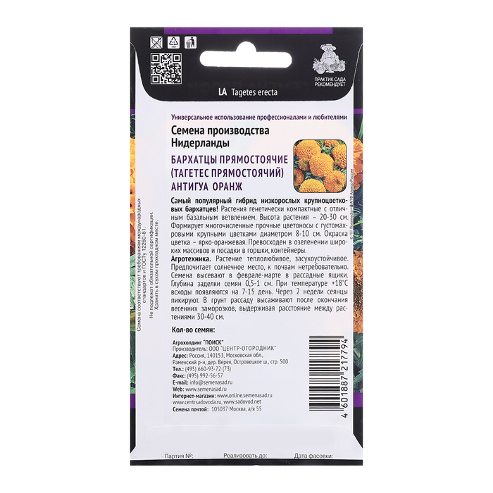 Габариты: 15 x 8 x 0,1 Страна: Нидерланды В боксе: 200 шт Состав: См. на упаковке Материалы: см. на упаковке Фасовка: по 10 шт Сертификат: Не подлежит сертификации Цвет: Оранжевый Вегетация: Однолетники Вид: Бархатцы Место выращивания: Открытый грунт Сухоцвет: Нет Махровые: Да По форме куста: Кустовая Назначение: Для создания цветников, клумбы Отношение к свету: Светолюбивые Разновидность: Цветущее Нуждаются ли в стратификации: Нет Самый популярный гибрид низкорослых крупноцветковых бархатцев! Растения генетически компактные с отличным базальным ветвлением. Высота растения 20-30 см. Формирует многочисленные прочные цветоносы с густомахровыми крупными цветками диаметром 8-10 см. Окраска цветка ярко-оранжевая. Превосходен в озеленении широких массивов и посадки в горшки, контейнеры.Агротехника. Растение теплолюбивое, засухоустойчивое. Предпочитает солнечное место, к почвам нетребовательно. Семена высевают в феврале-марте в рассадные ящики. Глубина заделки семян 0,5-1 см. При температуре +18°C всходы появляются на 7-15 день. Через 2 недели сеянцы пикируют. В грунт рассаду высаживают после окончания весенних заморозков, выдерживая расстояние между растениями 30-40 см.Семена соответствуют требованиям международных стандартов и ГОСТу РФ 12260-81 Комментарии к товару