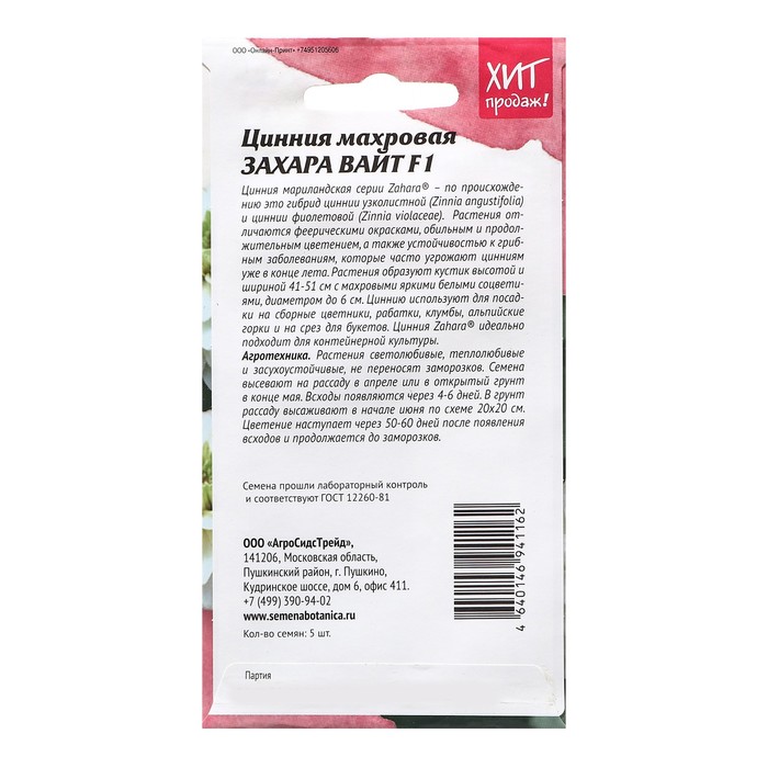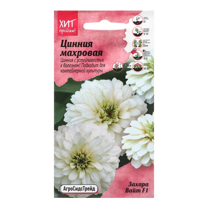 Цинния мэрилендская серии Zahara - по происхождению это гибрид циннии узколистной (Zinnia angustifolia) и циннии фиолетовой (Zinnia violaceae). Растения отличаются феерическими окрасками, обильным и продолжительным цветением, а также устойчивостью к грибным заболеваниям, которые часто угрожают цинниям уже в конце лета. Растения образуют кустик высотой и шириной 41-51 см с махровыми яркими белыми соцветиями, диаметром до 6 см. Циннию используют для посадки на сборные цветники, рабатки, клумбы, альпийские горки и на срез для букетов. Цинния Zahara идеально подходит для контейнерной культуры.