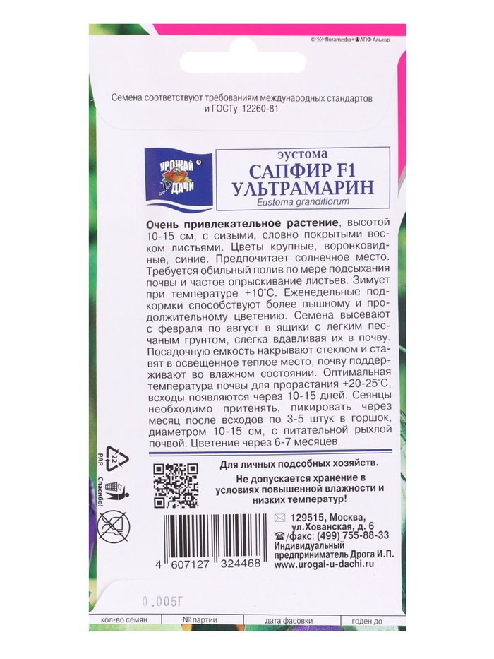 Производитель: УРОЖАЙ УДАЧИ Габариты: 15 x 8 x 0,2 Страна: Россия В боксе: 200 шт Состав: См. на упаковке Материалы: см. на упаковке Фасовка: по 10 шт Индивидуальная упаковка: Без упаковки Сертификат: Не подлежит сертификации Цвет: Синий Вегетация: Однолетники Вид: Эустома (Лизиантус) Цветение период: Июль, Июнь, Август Место выращивания: Открытый грунт Сухоцвет: Нет Махровые: Нет Высота растений: До 30 см По форме куста: Кустовая Назначение: Для создания цветников, клумбы Отношение к свету: Светолюбивые Разновидность: Цветущее