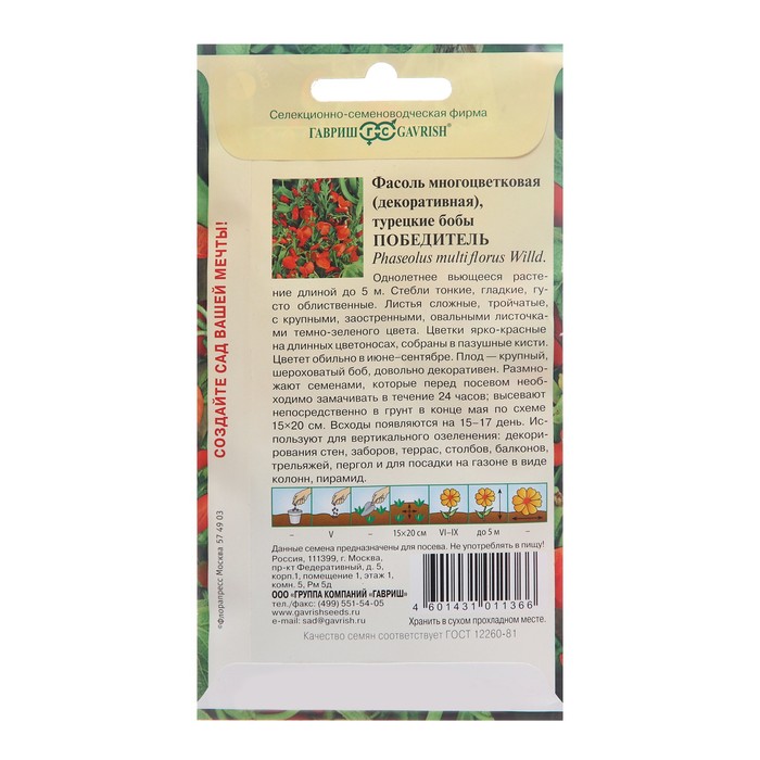 Однолетнее вьющееся растение длиной до 5 м. Стебли тонкие, гладкие, густо облиственные. Листья сложные, тройчатые, с крупными, заостренными, овальными листочками темно-зеленого цвета. Цветки ярко-красные на длинных цветоносах, собраны в пазушные кисти. Цветет обильно в июне-сентябре. Плод — крупный, шероховатый боб, довольно декоративен. Размножают семенами, которые перед посевом необходимо замачивать в течение 24 часов; высевают непосредственно в грунт в конце мае. Всходы появляются на 15-17 день. На постоянное место высаживают с комом земли после окончания весенних заморозков по схеме 15-20 см. Используют для вертикального озеленения - декорирования стен, заборов, террас, столбов, балконов, трельяжей, пергол и для посадки на газоне в виде колонн, пирамид.