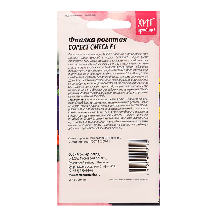 Фиалку, или виолу рогатую СОРБЕТ получили в результате скрещивания виолырогатойс виолой Виттрока. Гибрид фирмы PanAmerican Seed характеризуется длительным и продолжительным цветением, как весной, так и осенью, а также крупными круглыми цветками с плотными лепестками. Серия Сорбет - одна из самых популярных серий среди профессиональных озеленителей. Формирует компактный аккуратный кустик высотой 15-20см, усыпанный довольно крупными длярогатой виолы цветами от 2,5 до 4см. Цветки многочисленные, с рогообразным шпорцем. С мая по сентябрь на кустике распускается до 60 цветков. Используется создания цветочного ковра в саду, оформления альпийской горки, выращивания на балконе или подоконнике. За несколько сезонов растения фиалки рогатойобразуют сплошную подушку. Предпочитает легкую почву и полутень. Агротехника: Виолу можно выращивать в одно- и двухлетней культуре. 1 способ: на рассаду семена высевают в конце февраля – начале марта, слегка присыпая легким субстратом или песком. Посевы увлажняют из опрыскивателя и накрывают пленкой или стеклом. Всходы появляются на 14-20 день. Сеянцы необходимо притенять. В грунт рассаду высаживают в конце апреля – начале мая по схеме 20х20 см. 2 способ: семена высевают в июне-июле в открытый грунт, сильно не заглубляя. Осенью рассаду высаживают на постоянное место по схеме 20х20 см. Цветение начинается на следующий год в мае и продолжается несколько месяцев.