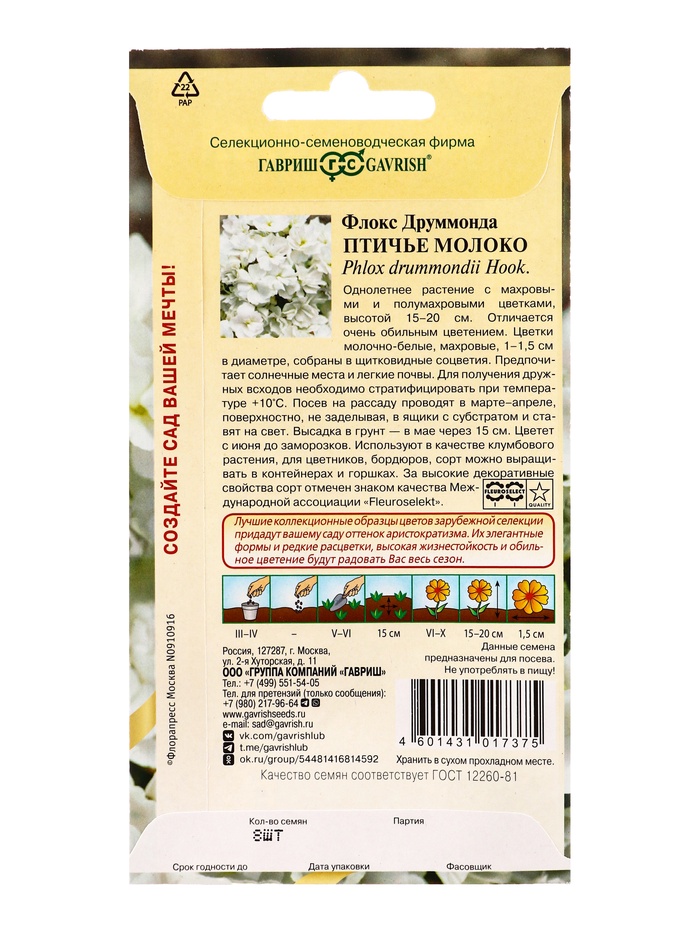 Семена цветов Флокс Птичье молоко, Друммонда* 8 шт. серия Элитная клумба DH