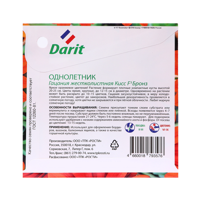 Габариты: 11,5 x 11,5 x 0,2 Страна: Россия В боксе: 200 шт Состав: Семена Материалы: семена Фасовка: по 10 шт Индивидуальная упаковка: Без упаковки Сертификат: Не подлежит сертификации Цвет: Оранжевый Вегетация: Однолетники Вид: Гацания Посев на рассаду: Март, Апрель Посев (посадка) в грунт: Июнь, Май Цветение период: Июнь, Сентябрь, Июль, Август Место выращивания: Открытый грунт, Подоконник, балкон Сухоцвет: Нет Махровые: Нет Высота растений: До 30 см По форме куста: Кустовая Назначение: Для балкона, веранды, Для создания цветников, клумбы Отношение к свету: Светолюбивые Разновидность: Цветущее Нуждаются ли в стратификации: Нет Гацания жестколистная Кисс F1 Бронз, однолетник. Яркие оранжевые соцветия! Растение формирует плотные компактные кусты высотой 20-25 см. Цветы яркие, крупные, до 12-15 см в диаметре. Одновременно на растении может быть раскрыто до 10–15 цветков. Гацания засухоустойчивое, в меру холодостойкое растение, цветет до заморозков. Наибольшая декоративность проявляется в солнечную погоду, хотя цветки не закрываются и при лёгкой облачности. Любит жаркую солнечную погоду! Особенности выращивания: семена посыпают тонким слоем субстрата или вермикулита и накрывают стеклом или пленкой. Всходы появляются через 4-7 дней после посева. Субстрат должен быть постоянно влажным, но не переувлажненным. Температура прорастания 21-24С. Через 5-6 недель сеянцы пикируют. Для подкормок используют удобрения с низким содержанием аммонийного азота и фосфора. От посева до цветения 13-15 недель. Применение: используют для оформления бордюров, вазонов, балконных ящиков, а также в качестве горшечной культуры. Комментарии к товару