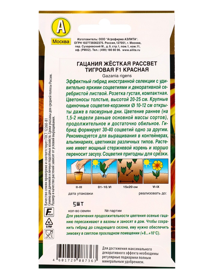 Габариты: 0,1 x 8 x 15 Страна: США В боксе: 50 шт Состав: См. на упаковке Материалы: см. на упаковке Фасовка: по 10 шт Индивидуальная упаковка: Без упаковки Сертификат: Не подлежит сертификации Цвет: Оранжевый Высота, см: 20 - 25 Вегетация: Однолетники Вид: Гацания Посев на рассаду: Март, Апрель Посев (посадка) в грунт: Июнь, Май Цветение период: Август, Июнь, Сентябрь, Июль Упаковка: Цветная Место выращивания: Открытый грунт, Подоконник, балкон Сухоцвет: Нет Махровые: Нет Высота растений: До 30 см По форме куста: Кустовая Назначение: Для создания цветников, клумбы, Для балкона, веранды Отношение к свету: Светолюбивые Разновидность: Цветущее Нуждаются ли в стратификации: Нет Гацания «Рассвет» подходит для выращивания в контейнерах на балконе и в саду, в альпинариях, рабатках, палисадниках, миксбордерах, на клумбах и не только. Она имеет компактную густую розетку серебристых листьев высотой 20–30 см. Отличается продолжительным цветением с июля до поздней осени. Растение предпочитает солнечные сухие участки с дренированной лёгкой питательной почвой. Оно хорошо реагирует на подкормки. Легко переносит засуху и жару. Для увеличения сроков цветения осенью пересаживайте гацанию в вазоны и заносите в дом. Чтобы сохранить гибрид до следующего сезона, поставьте его в светлом прохладном помещении с температурой 8–10 °С. Сорт пригоден для срезки. Для продолжительного и обильного цветения осуществляйте своевременный полив, регулярную прополку, рыхление и подкормку минеральными удобрениями. Высота: 20–25 см. Диаметр: 10–12 см. Комментарии к товару