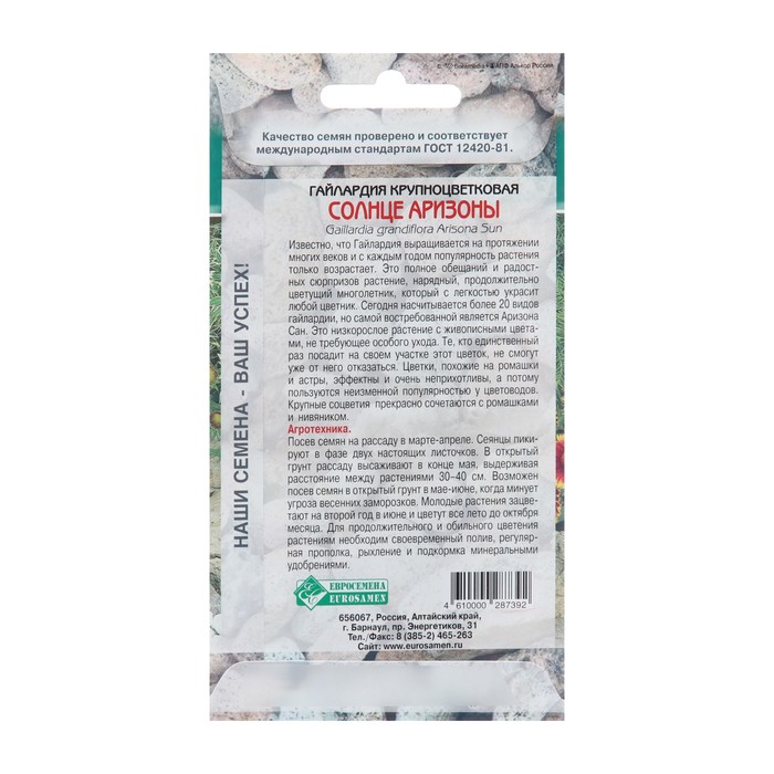 Габариты: 15 x 8 x 0,2 Страна: Россия В боксе: 200 шт Состав: См. на упаковке Материалы: см. на упаковке Фасовка: по 10 шт Индивидуальная упаковка: Без упаковки Сертификат: Не подлежит сертификации Цвет: Жёлтый, Красный Вегетация: Многолетники Вид: Гайлардия Посев на рассаду: Март, Февраль Посев (посадка) в грунт: Май Цветение период: Октябрь, Август, Июль, Сентябрь, Июнь Место выращивания: Универсальный Сорт: Солнце Аризоны Сухоцвет: Да Махровые: Да Высота растений: До 30 см По форме куста: Кустовая Назначение: Для создания цветников, клумбы Отношение к свету: Светолюбивые Нуждаются ли в стратификации: Нет Наша коллекция семян включает как популярные овощи, так и яркие цветы, идеально подходящие для вашего сада. С нами вы сможете наслаждаться богатым урожаем и великолепием цветения в любое время года. Данные семена идеально подойдут для выращивания в вашем саду. Комментарии к товару