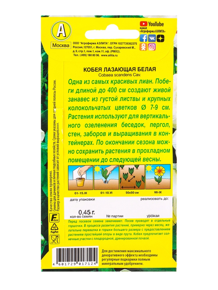 Семена цветов Кобея белая , Ц/П,0,45 г