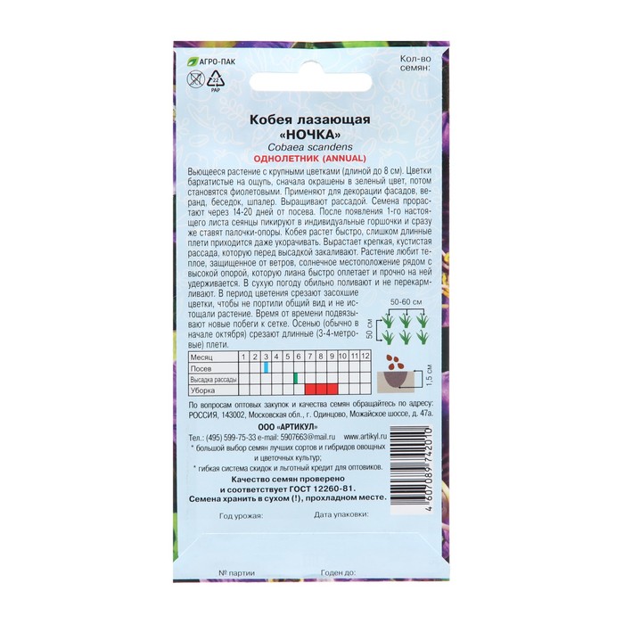 Габариты: 15 x 8 x 0,2 Страна: Россия В боксе: 300 шт Состав: См. на упаковке Материалы: см. на упаковке Фасовка: по 2 шт Индивидуальная упаковка: Без упаковки Сертификат: Не подлежит сертификации Цвет: Фиолетовый Вегетация: Однолетники Вид: Кобея Цветение период: Июль, Сентябрь, Август, Октябрь Место выращивания: Открытый грунт Сухоцвет: Нет Махровые: Нет Высота растений: Выше 200 см По форме куста: Лиана (вьющиеся) Назначение: Для балкона, веранды, Для вертикального озеленения Отношение к свету: Светолюбивые Разновидность: Цветущее Вид: Семечки Наша коллекция семян включает как популярные овощи, так и яркие цветы, идеально подходящие для вашего сада. С нами вы сможете наслаждаться богатым урожаем и великолепием цветения в любое время года. Данные семена идеально подойдут для выращивания в вашем саду. Комментарии к товару