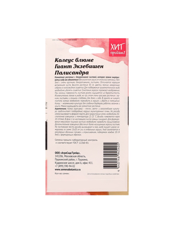 Габариты: 15 x 8 x 0,2 Страна: Нидерланды В боксе: 700 шт Состав: Семена Материалы: семена Фасовка: по 10 шт Индивидуальная упаковка: Без упаковки Сертификат: Не подлежит сертификации Цвет: Бордовый Размер семян, мм: 2 Количество семян, г: 10 Количество семян, шт: 10 Вегетация: Однолетники Вид: Колеус Посев на рассаду: Февраль, Март Место выращивания: Универсальный Подходит для балкона: Да Сухоцвет: Да Махровые: Нет По форме куста: Ампельная, Кустовая Назначение: Для балкона, веранды, Для комнатного выращивания, Для создания цветников, клумбы Отношение к свету: Рассеянный свет Разновидность: Декоративно-лиственные Вид: Горошины Нуждаются ли в стратификации: Нет Комнатное растение с декоративной листвой, которое можно выращивать в Саду как однолетник! Великолепная серия от японской компании Takii Seed с очень крупными декоративными листьями. Отличается хорошим ветвлением куста. Высота растения 50 см. Цветки мелкие, невзрачные, собраны в колосовидное соцветие. Для поддержания привлекательного вида необходимо удалять соцветия. Сочетания окрасок поражают воображение. При касании поверхности листьев руками ощущается их бархатистость. Исключительно легкое в уходе, но при этом очень красивое растение с яркими листьями и сочными стеблями для дома и сада. В грунте не зимует, поэтому осенью необходимо пересадить в горшок и убрать в помещение. Колеус – незаменимая культура для создания бордюров, рабаток, вазонов и кашпо. Можно выращивать как комнатное растение. Агротехника: Колеус (крапивка) – тепло-, свето- и влаголюбивая культура, предпочитает плодородные хорошо окультуренные почвы. На рассаду семена высевают в феврале-марте. Для прорастания семян необходимо достаточное освещение и температура 21-25˚С. Всходы появляются через 10-14 дней. В фазе 2-го настоящего листа сеянцы пикируют. Для формирования невысокого пышного кустика необходимо проводить прищипывание. Дополнительное освещение обеспечит более насыщенную окраску листьев. На постоянное место рассаду высаживают в мае, когда минует угроза заморозков, по схеме 15х20 см или в отдельные горшки. Уход заключается в регулярных обильных поливах и опрыскиваниях, подкормках каждые 10-14 дней и формирующих обрезках. Штрих-код - Комментарии к товару