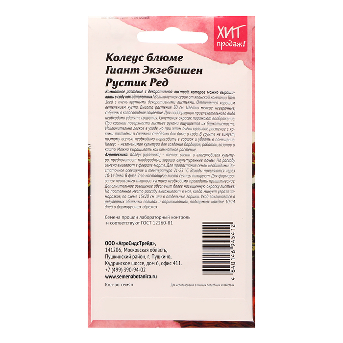 Комнатное растение с декоративной листвой, которое можно выращивать в Саду как однолетник! Великолепная серия от японской компании Takii Seed с очень крупными декоративными листьями. Отличается хорошим ветвлением куста. Высота растения 50 см. Цветки мелкие, невзрачные, собраны в колосовидное соцветие. Для поддержания привлекательного вида необходимо удалять соцветия. Сочетания окрасок поражают воображение. При касании поверхности листьев руками ощущается их бархатистость. Исключительно легкое в уходе, но при этом очень красивое растение с яркими листьями и сочными стеблями для дома и сада. В грунте не зимует, поэтому осенью необходимо пересадить в горшок и убрать в помещение. Колеус – незаменимая культура для создания бордюров, рабаток, вазонов и кашпо. Можно выращивать как комнатное растение. Агротехника: Колеус (крапивка) – тепло-, свето- и влаголюбивая культура, предпочитает плодородные хорошо окультуренные почвы. На рассаду семена высевают в феврале-марте. Для прорастания семян необходимо достаточное освещение и температура 21-25˚С. Всходы появляются через 10-14 дней. В фазе 2-го настоящего листа сеянцы пикируют. Для формирования невысокого пышного кустика необходимо проводить прищипывание. Дополнительное освещение обеспечит более насыщенную окраску листьев. На постоянное место рассаду высаживают в мае, когда минует угроза заморозков, по схеме 15х20 см или в отдельные горшки. Уход заключается в регулярных обильных поливах и опрыскиваниях, подкормках каждые 10-14 дней и формирующих обрезках. Штрих-код -