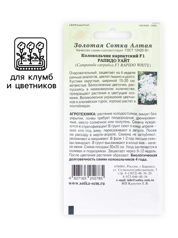 Производитель: Золотая Сотка Алтая Габариты: 15 x 8 x 0,5 Страна: Россия В боксе: 300 шт Состав: Семена Материалы: семена Фасовка: по 10 шт Индивидуальная упаковка: Без упаковки Сертификат: Не подлежит сертификации Цвет: Белый Вегетация: Многолетники Вид: Колокольчик Место выращивания: Открытый грунт Сухоцвет: Нет Махровые: Нет По форме куста: Ампельная, Кустовая Назначение: Для создания цветников, клумбы Отношение к свету: Рассеянный свет Разновидность: Цветущее Нуждаются ли в стратификации: Нет
