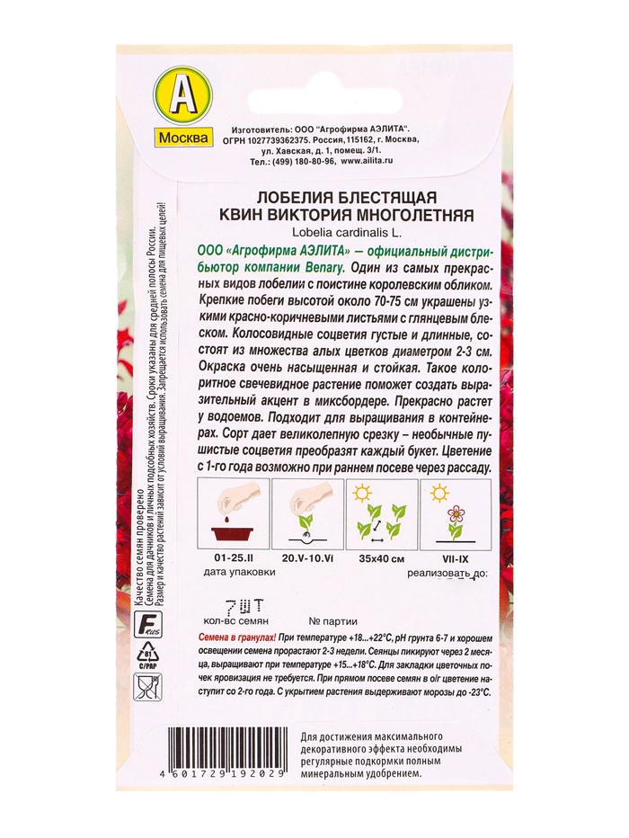 Производитель: Агрофирма АЭЛИТА Габариты: 15 x 8 x 0,2 Страна: Германия В боксе: 150 шт Состав: См. на упаковке Материалы: см. на упаковке Фасовка: по 10 шт Индивидуальная упаковка: Без упаковки Сертификат: Не подлежит сертификации Цвет: Красный Вегетация: Многолетники Вид: Лобелия Посев на рассаду: Февраль Посев (посадка) в грунт: Июнь, Май Цветение период: Сентябрь, Август Место выращивания: Подоконник, балкон, Открытый грунт Сухоцвет: Нет Махровые: Нет Высота растений: 60-100 см По форме куста: Кустовая Назначение: Для создания цветников, клумбы Отношение к свету: Светолюбивые Нуждаются ли в стратификации: Нет