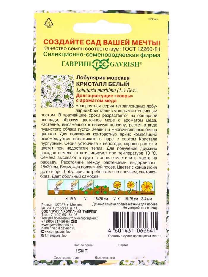 Семена цветов Лобулярия Кристалл Белый 15 шт.* серия Элитная клумба