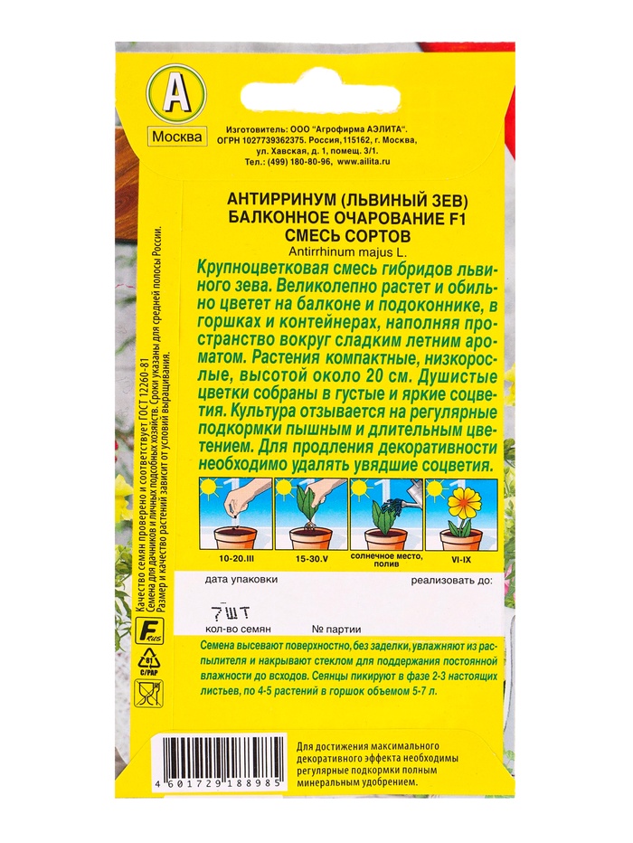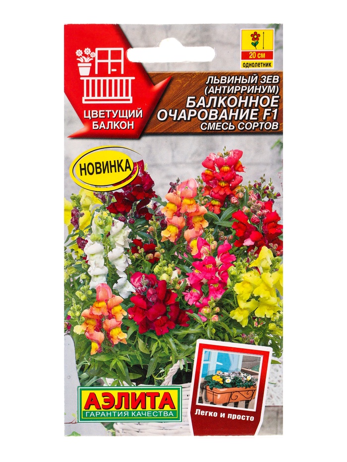 Габариты: 15 x 8 x 0,2 Страна: Гватемала В боксе: 200 шт Состав: См. на упаковке Материалы: см. на упаковке Фасовка: по 10 шт Индивидуальная упаковка: Без упаковки Сертификат: Не подлежит сертификации Цвет: МИКС Вегетация: Однолетники Вид: Львиный зев Посев на рассаду: Март Цветение период: Июнь, Август, Сентябрь, Июль Место выращивания: Подоконник, балкон Сухоцвет: Нет Махровые: Нет Высота растений: До 30 см По форме куста: Кустовая Назначение: Для балкона, веранды, Для создания цветников, клумбы Отношение к свету: Светолюбивые Нуждаются ли в стратификации: Нет Комментарии к товару