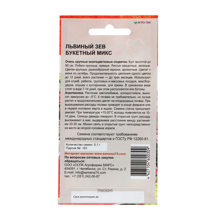 Производитель: Уральский Дачник Габариты: 15 x 8 x 0,2 Страна: Россия В боксе: 300 шт Состав: См. на упаковке Материалы: см. на упаковке Фасовка: по 10 шт Индивидуальная упаковка: Без упаковки Сертификат: Не подлежит сертификации Цвет: МИКС Вегетация: Однолетники Вид: Львиный зев Место выращивания: Открытый грунт Сухоцвет: Нет Махровые: Нет По форме куста: Кустовая Назначение: Для создания цветников, клумбы Отношение к свету: Светолюбивые Разновидность: Цветущее Нуждаются ли в стратификации: Нет