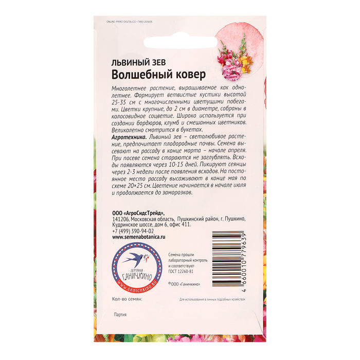 Нуждаются ли в стратификации: Нет Многолетнее растение, выращиваемое как однолетнее. Формирует ветвистые кустики высотой 25-35 см с многочисленными цветущими побегами. Цветки крупные, до 2 см в диаметре, собраны в колосовидное соцветие. Широко используется при создании бордюров, клумб и смешанных цветников. Великолепно смотрится в букетах. Агротехника: Львиный зев – светолюбивое растение, предпочитает плодородные почвы. Семена высевают на рассаду в конце марта – начале апреля. При посеве семена стараются не заглублять. Всходы появляются через 10-15 дней. Пикируют сеянцы через 2-3 недели после появления всходов. На постоянное место рассаду высаживают в конце мая по схеме 20×25 см. Цветение начинается в начале июля и продолжается до заморозков. Штрих-код – 4660010779639