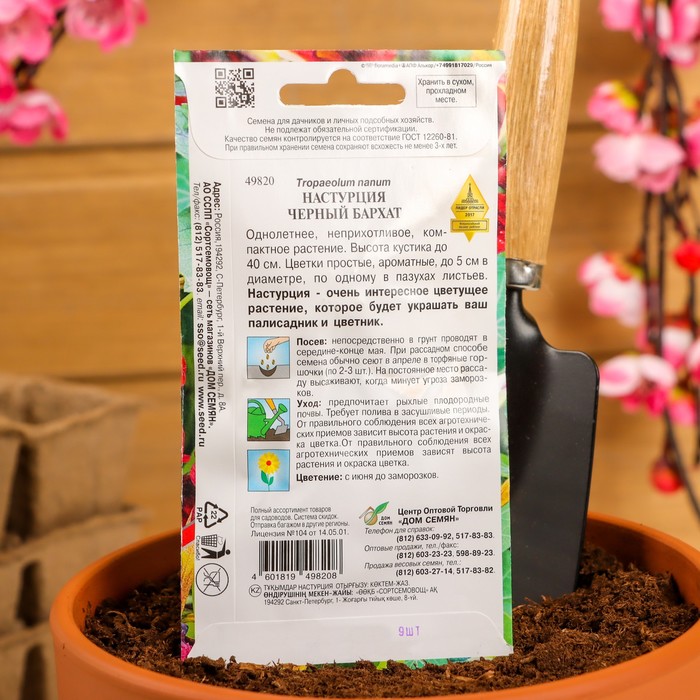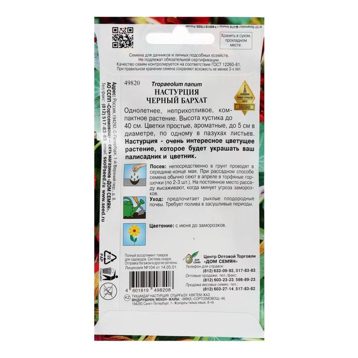 Габариты: 15 x 8 x 0,2 Страна: Россия В боксе: 1400 шт Состав: Семена Материалы: семена Фасовка: по 10 шт Индивидуальная упаковка: Без упаковки Сертификат: Не подлежит сертификации Цвет: Красный Вегетация: Однолетники Вид: Настурция Цветение период: Июль, Июнь, Август, Сентябрь Место выращивания: Открытый грунт Сухоцвет: Нет Махровые: Нет Высота растений: 30-60 см По форме куста: Кустовая Назначение: Для создания цветников, клумбы Отношение к свету: Светолюбивые Разновидность: Цветущее Нуждаются ли в стратификации: Нет Эта интересная новая настурция привлечет не только Ваше внимание таким удивительным контрастом «бархатных» цветков тёмно-бордовой, в некоторых стадиях развития почти чёрной, окраски и ярко-зеленых листьев, но также привлечет своим нежным приятным ароматом насекомых-опылителей в Ваш сад. Растение компактное, эффектное, с душистыми, крупными (4-6см в диаметре) цветками с одним шпорцем, возвышающимися над листвой. Стебли ветвистые, невысокие, высотой до 40см. Цветет обильно с июня до заморозков. Дает хороший самосев. Отлично подходит для выращивания в различных бордюрах, цветниках, вазонах или контейнерах, а также великолепно украсит Ваш балкон или лоджию. Посев: в открытый грунт в конце мая по схеме 15x20см или в горшки 9см диаметром. Глубина заделки семян 1,5см. Предпочитает умеренно плодородную, лёгкую, хорошо дренированную почву. Перед посевом семена замачивают в тёплой воде (T 40-45°С). Всходы появляются через 14-20 дней. Уход: полив в начале роста, а после зацветания — при сильном усыхании почвы. Подкормки проводить лишь до цветения с интервалом 7-10 дней раствором комплексного минерального удобрения. Внимание! При внесении свежих органических удобрений, избытке азота и влаги растение формирует более мощный листовой аппарат, но позже и хуже цветет. Комментарии к товару