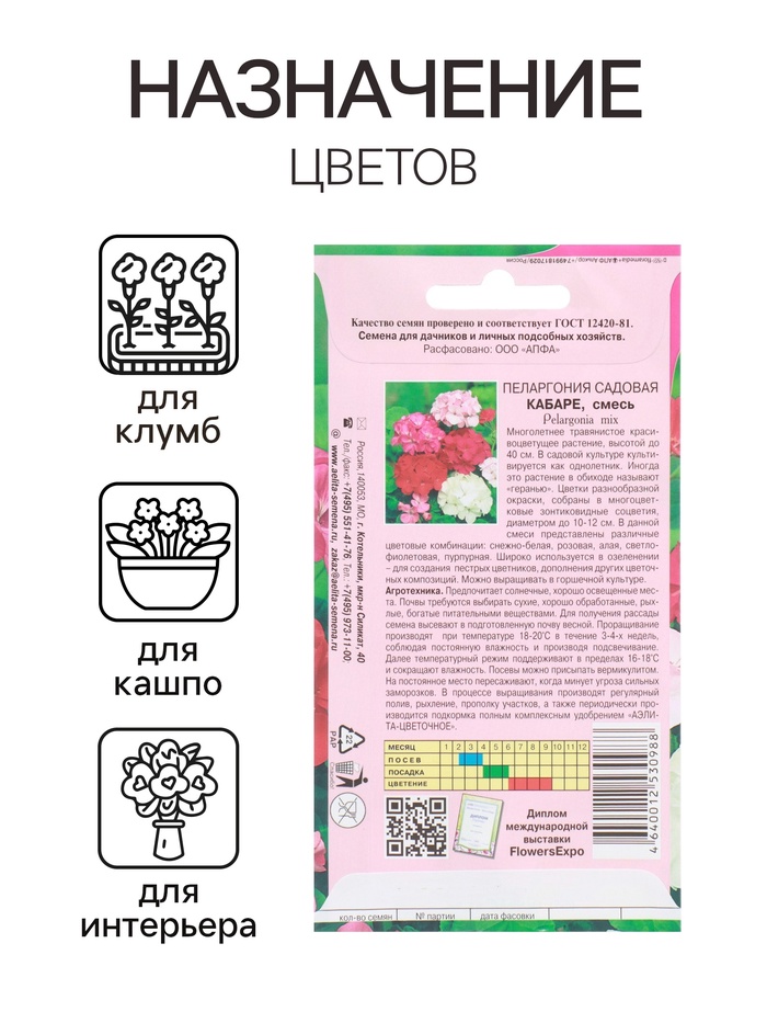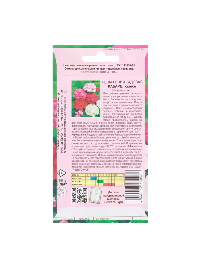 Габариты: 15 x 8 x 0,1 Страна: Россия В боксе: 150 шт Состав: Семена Материалы: семена Фасовка: по 10 шт Индивидуальная упаковка: Без упаковки Сертификат: Не подлежит сертификации Цвет: МИКС Высота, см: 40 Вегетация: Многолетники, Однолетники Вид: Пеларгония Посев на рассаду: Ноябрь, Декабрь, Март, Январь, Февраль Посев (посадка) в грунт: Июль, Апрель, Июнь, Март, Май Цветение период: Июль, Апрель, Май, Июнь Место выращивания: Комнатное выращивание, Открытый грунт, Подоконник, балкон Подходит для балкона: Нет Сухоцвет: Нет Махровые: Да Высота растений: 30-60 см По форме куста: Кустовая Назначение: Для создания цветников, клумбы Отношение к свету: Рассеянный свет Разновидность: Цветущее Вид: Семечки Нуждаются ли в стратификации: Нет Комнатная Пеларгония Пеларгония - популярное многолетнее комнатное растение из семейства Гераниевых. Оно формирует объемный и компактный кустик высотой около 30 см. Листья и цветки: Листья зеленые, с характерным темным рисунком. Восхитительные цветки разнообразной окраски образуют крупные, шаровидные соцветия диаметром 9-12 см. Условия роста: При тщательном уходе пеларгония может цвести весь год. Это светолюбивое растение, неприхотливое в культуре, легко переносит недостаток влаги. Рекомендуется размещать его на солнечных восточных и западных окнах. Полив и подкормка: В теплое время года пеларгония любит обильный, частый полив. Зимой, в зависимости от температуры, поливают умереннее. Растение подкармливают минеральными удобрениями, обогащенными калием. Посев и размножение: Для получения цветущих растений к началу лета посевы производят с декабря по февраль, используя в качестве субстрата чистый торф или смесь торфа с песком. Для комнатного использования высевают в марте-апреле. Всходы обычно появляются через 2-3 недели после посева. Пикировка и прищипка: В фазе двух-трех настоящих листочков растения пикируют в горшки. Для лучшего кущения рассаду прищипывают над пятым-шестым листом. Летний и зимний уход: Летом пеларгонию желательно выносить на свежий воздух, а зимой устанавливать в прохладной светлой комнате с температурой 10-12 °C. Использование: Геранями озеленяют балконы, веранды, лоджии. Их используют в цветочных композициях в полутенистых участках сада. Комментарии к товару