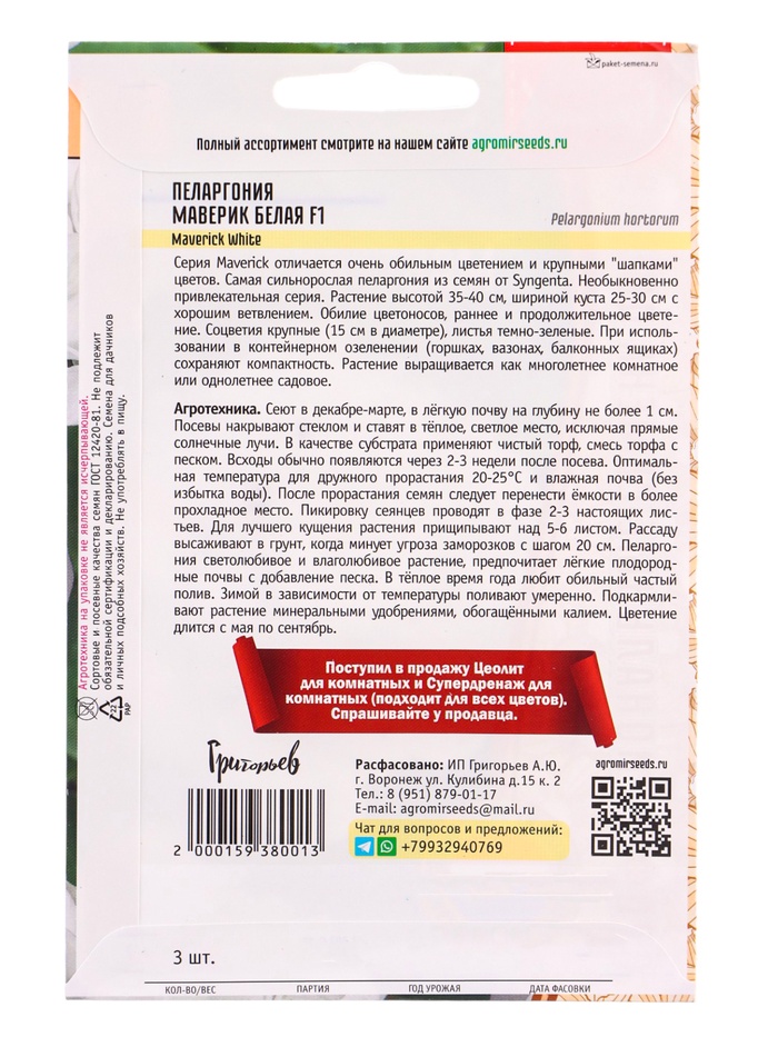 Габариты: 15 x 11,5 x 0,1 Страна: Россия В боксе: 100 шт Состав: Семена Материалы: семена Фасовка: по 10 шт Индивидуальная упаковка: Без упаковки Сертификат: Не подлежит сертификации Цвет: Белый Вегетация: Многолетники Вид: Пеларгония Посев на рассаду: Март, Февраль Посев (посадка) в грунт: Май, Июнь Цветение период: Сентябрь, Август, Июнь, Июль Место выращивания: Открытый грунт, Подоконник, балкон Сухоцвет: Нет Махровые: Да Высота растений: 30-60 см По форме куста: Кустовая Назначение: Для создания цветников, клумбы Отношение к свету: Светолюбивые Нуждаются ли в стратификации: Нет Комментарии к товару