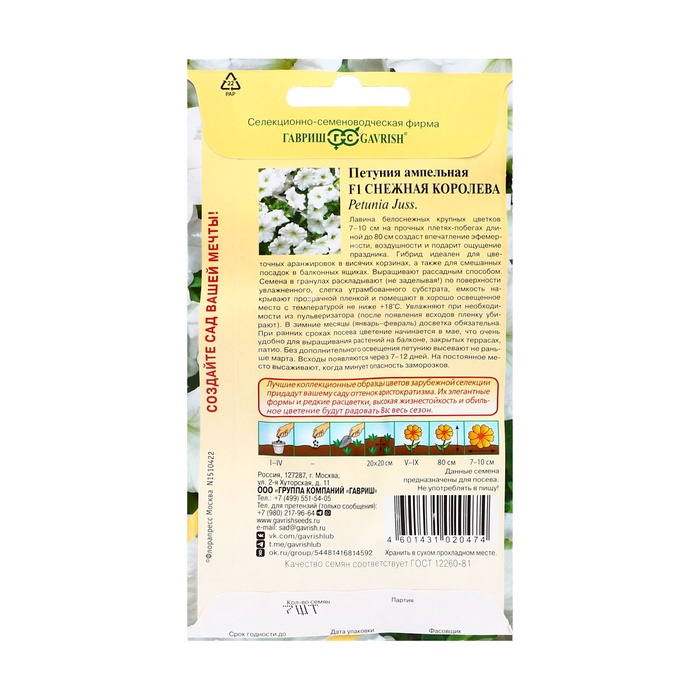 Лавина белоснежных крупных цветков 7-10 см, на прочных плетях-побегах длиной до 80 см, создаст впечатления эфемерности, воздушности и подарит ощущение праздника. Идеальны для цветочных аранжировок в висячих корзинах, а также для смешанных посадок в балконных ящиках. Выращивают рассадным способом. Посев проводят с января по апрель, поверхностно, под стекло (после появления всходов стекло убирают). В зимние месяцы январь-февраль досветка обязательна. При ранних сроках посева цветение начинается в мае, что очень удобно для выращивания растений на балконе, закрытых террасах, патио. Без дополнительного освещения петунию высевают не раньше марта. Всходы появляются через 7-12 дней. На постоянное место высаживают, когда минует опасность заморозков. Светолюбива и достаточно засухоустойчива. Предпочитает легкие, плодородные, хорошо дренированные почвы. На зиму петунию можно сильно обрезать и сохранять в освещенном помещении при температуре воздуха не более 12°C и умеренном поливе.
