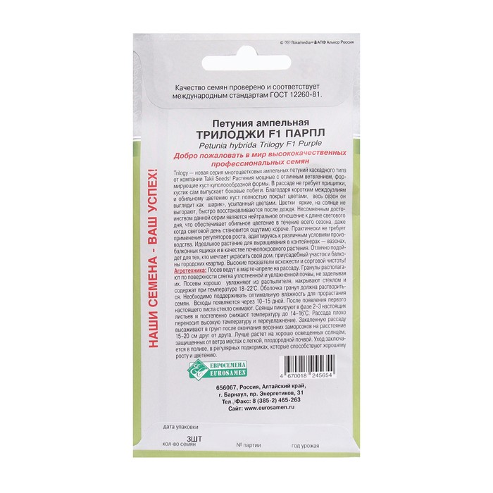 Габариты: 15 x 8 x 0,5 Страна: Россия В боксе: 100 шт Состав: См. на упаковке Материалы: см. на упаковке Фасовка: по 10 шт Индивидуальная упаковка: Без упаковки Сертификат: Не подлежит сертификации Цвет: Розовый Вегетация: Однолетники Вид: Петуния Место выращивания: Открытый грунт Сухоцвет: Нет Махровые: Нет По форме куста: Кустовая Назначение: Для балкона, веранды, Для создания цветников, клумбы Отношение к свету: Светолюбивые Разновидность: Цветущее Нуждаются ли в стратификации: Нет Растения мощные с отличным ветвлением, формирующие куст куполоообразной формы. В рассаде не требует прищипки, кустик сам выпускает боковые побеги. Благодаря коротким междоузлиям и обильному цветению куст полностью покрыт цветами, весь сезон он выглядит как "шарик", усыпанный цветами. Цветки яркие, на солнце не выгорают, быстро восстанавливаются после дождя. Несомненным достоинством данной серии является нейтральное отношение к длине светового дня, что обеспечивает обильное цветение в течение всего сезона, даже когда световой день становится ощутимо короче. Практически не требует применения регуляторов роста, адаптируясь к различным условиям производства. Посев ведут в марте-апреле на рассаду. Гранулы располагают по поверхности слегка уплотненной и увлажненной почвы, не заделывая их.Посевы хорошо увлажняют из распылителя, накрывают стеклом и содержат при температуре 18-22 градусов С.Оболочка гранул должна раствориться. Необходимо поддерживать оптимальную влажность для прорастания семян. Всходы появляются через 10-15 дней. После появления первого настоящего листа стекло снимают.Сеянцы пикируют в фазе 2-3 настоящих листьев и постепенно снижают температуру до 14-16 градусов С. Рассада плохо переносит высокую температуру и переувлажнение.Закаленную рассаду высаживают в грунт после окончания весенних заморозков на расстояние 15-20 см друг от друга. Лучше растет на хорошо освещенных солнцем, защищенных от ветра местах с легкой, плодородной почвой. Уход заключается в поливе, в регулярных подкормках, которые способствуют хорошему росту и цветению. Комментарии к товару