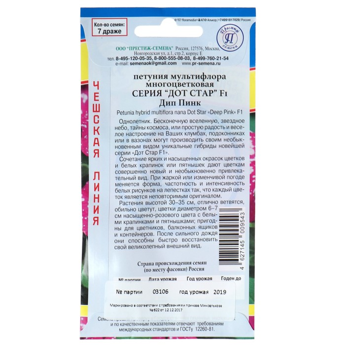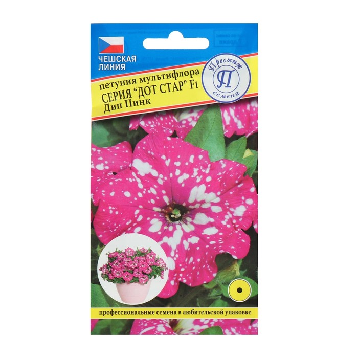 Габариты: 15 x 8 x 0,2 Страна: Россия В боксе: 600 шт Состав: Семена Материалы: семена Фасовка: по 10 шт Индивидуальная упаковка: Без упаковки Сертификат: Не подлежит сертификации Цвет: Разноцветный Высота, см: 30 - 35 Вегетация: Однолетники Вид: Петуния Посев на рассаду: Март, Февраль Посев (посадка) в грунт: Май Цветение период: Июль, Июнь, Сентябрь, Август Упаковка: Цветная Место выращивания: Универсальный Сухоцвет: Нет Махровые: Нет Высота растений: 30-60 см По форме куста: Кустовая Назначение: Для создания цветников, клумбы Отношение к свету: Светолюбивые Разновидность: Цветущее Нуждаются ли в стратификации: Нет Однолетник. Бесконечную вселенную, звездное небо, тайны космоса, или простую радость и веселое настроение на Ваших клумбах, подоконниках или в вазонах могут производить своим необыкновенным видом уникальные гибриды новейшей серии «Дот Стар Е1». Сочетание ярких и насыщенных окрасок цветков и белых крапинок или пятнышек дают цветкам совершенно новый и необыкновенно привлекательный вид. При жаркой или изменчивой погоде меняется форма, частотность и интенсивность белых рисунков на лепестках так, что каждый цветок является неповторимым оригиналом. Растения высотой 30-35 см, отлично ветвятся, обильно цветут, цветки диаметром 6-7 —см насыщенно-розового цвета с белыми крапинками и пятнышками, пригодны для цветников, балконных ящиков и контейнеров. После сильного дождя они способны быстро восстановить свой великолепный внешний вид. Комментарии к товару
