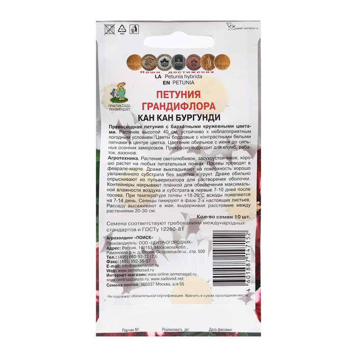 Габариты: 15 x 8 x 1 Страна: Италия В боксе: 1000 шт Состав: См. на упаковке Материалы: см. на упаковке Фасовка: по 10 шт Индивидуальная упаковка: Без упаковки Сертификат: Не подлежит сертификации Цвет: Разноцветный, Бордовый, Белый Вегетация: Однолетники Вид: Петуния Место выращивания: Открытый грунт Сухоцвет: Нет Махровые: Нет По форме куста: Кустовая Назначение: Для создания цветников, клумбы, Для балкона, веранды Отношение к свету: Светолюбивые Разновидность: Цветущее Нуждаются ли в стратификации: Нет Фиксированная цена: Да ПЕТУНИЯ ГРАНДИФЛОРА КАН КАН БУРГУНДИ Превосходная петуния с бархатными кружевными цветами. Растение высотой 40 см, устойчиво к кнеблагоприятным погодным условиям. Цветы бордовые с контрастными белыми пятнами в центре цветка, Цветение обильное с июня до сильных осенних заморозков. Прекрасно подходит для клумб, раба- ток, вазонов. Агротехника. Растение светолюбивое, засухоустойчивое, хорошо растет на любых питательных почвах. Посевы проводят в феврале-марте. Драже выкладывают на поверхность хорошо увлажнённого субстрата без заделки в грунт. Драже обильно опрыскивают из пульверизатора для растворения оболочки. Контейнеры накрывают пленкой для обеспечения максимальной влажности воздуха и субстрата в первые 7-10 дней после посева. При температуре почвы +18-20°С всходы появляются на 7-14 день. Сеянцы пикируют в фазе 2-х настоящих листьев. Рассаду высаживают в мае, выдерживая расстояние между растениями 20-30 см. Комментарии к товару